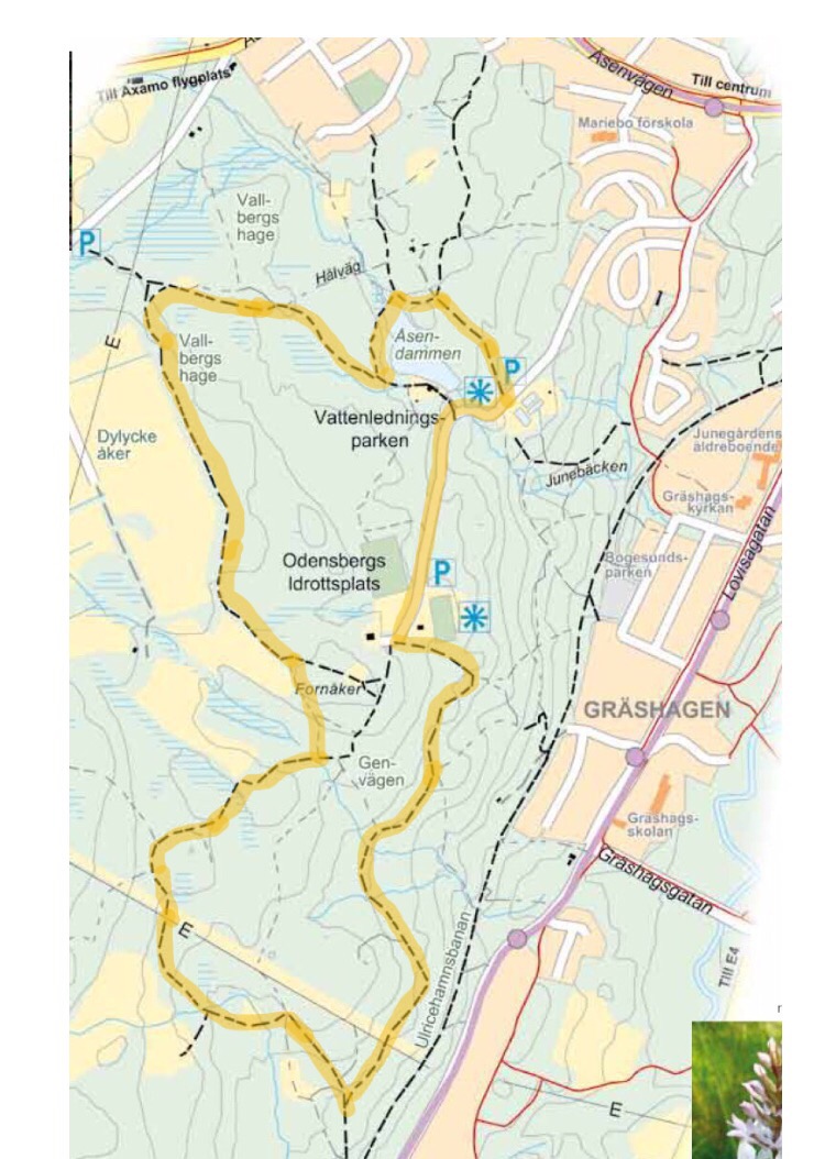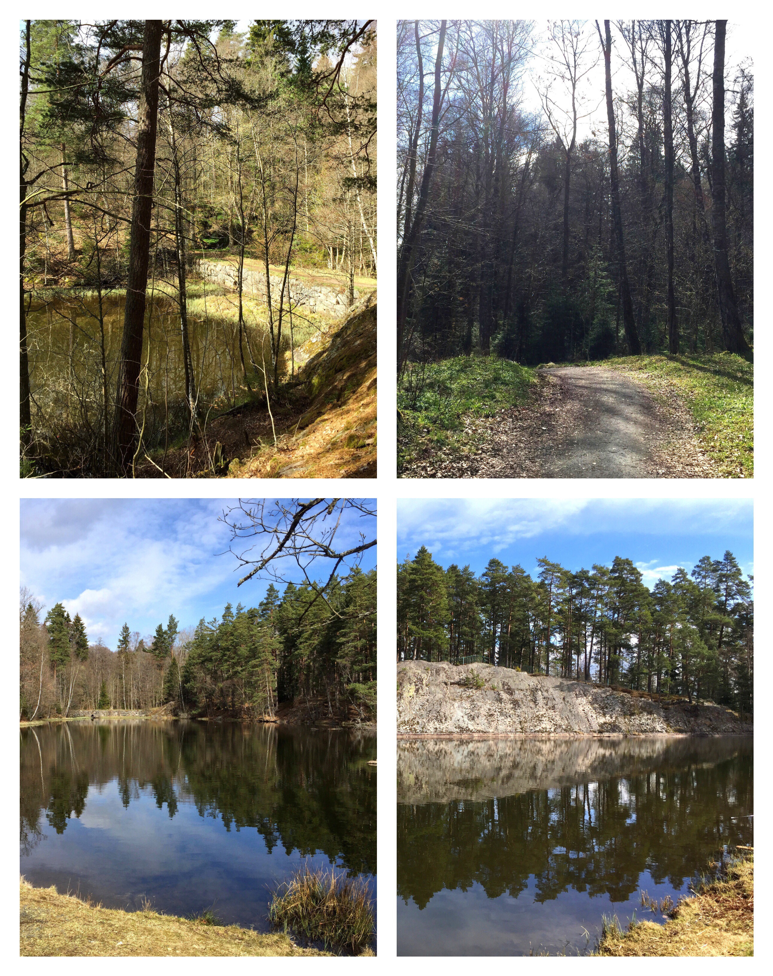 Vi började att gå ifrån parkeringen för Vattenledningsparken och gick upp i en vacker blandskog där lövträden bär knoppar och vitsipporna har börjat breda ut sig som en grön- och vitfläckig matta. Snart skymtar Åsendammen mellan träden, och det finns flera fornlämningar i området. Dammen är väldigt vacker, och det är värt att gå av stigen och närma sig dammen för att njuta lite extra av området.