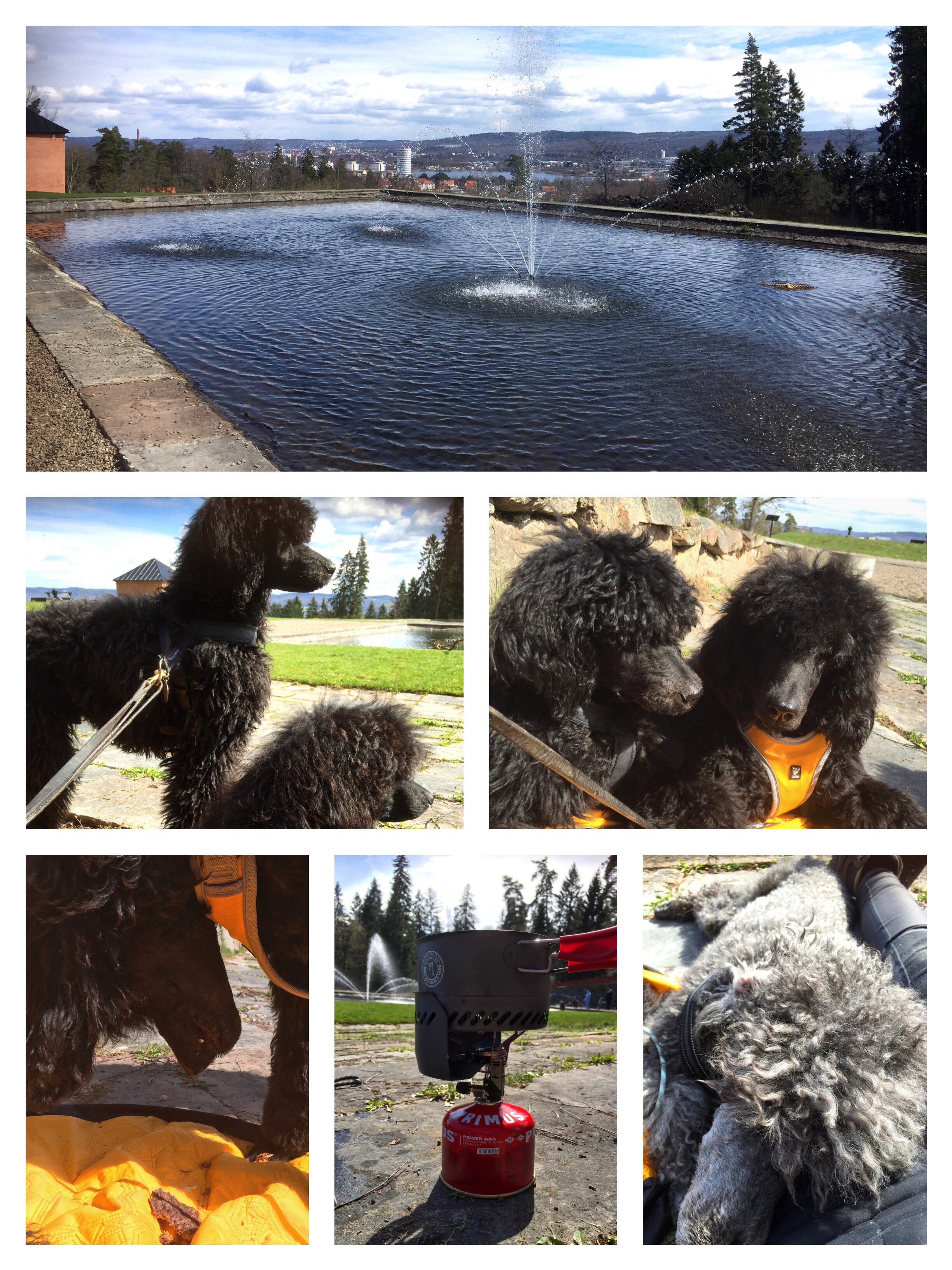 Väl tillbaka till parkeringen gick vi ner till fontänerna, där det också bjuds på en fin utsikt över Jönköping. Det var en del folk där, men vi hittade ett lugnt hörn där vi kunde sätta oss ner och avsluta turen med lite mat. Hundarna fick varsin torkad burgare, viltkött till Charlie och Chiko, och vom till Oliver. Själv satte jag igång primusköket och testade en pasta- och svamprätt.