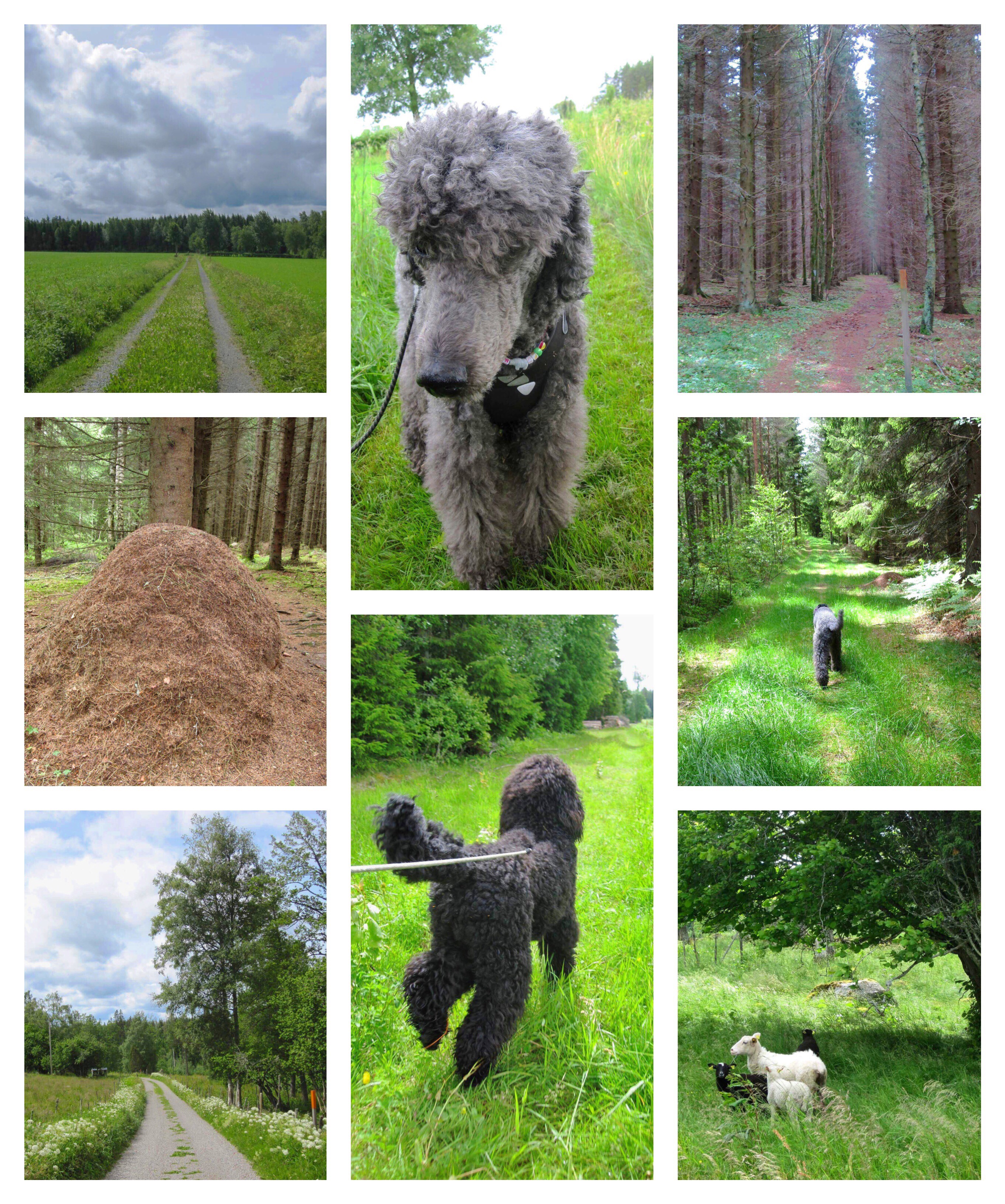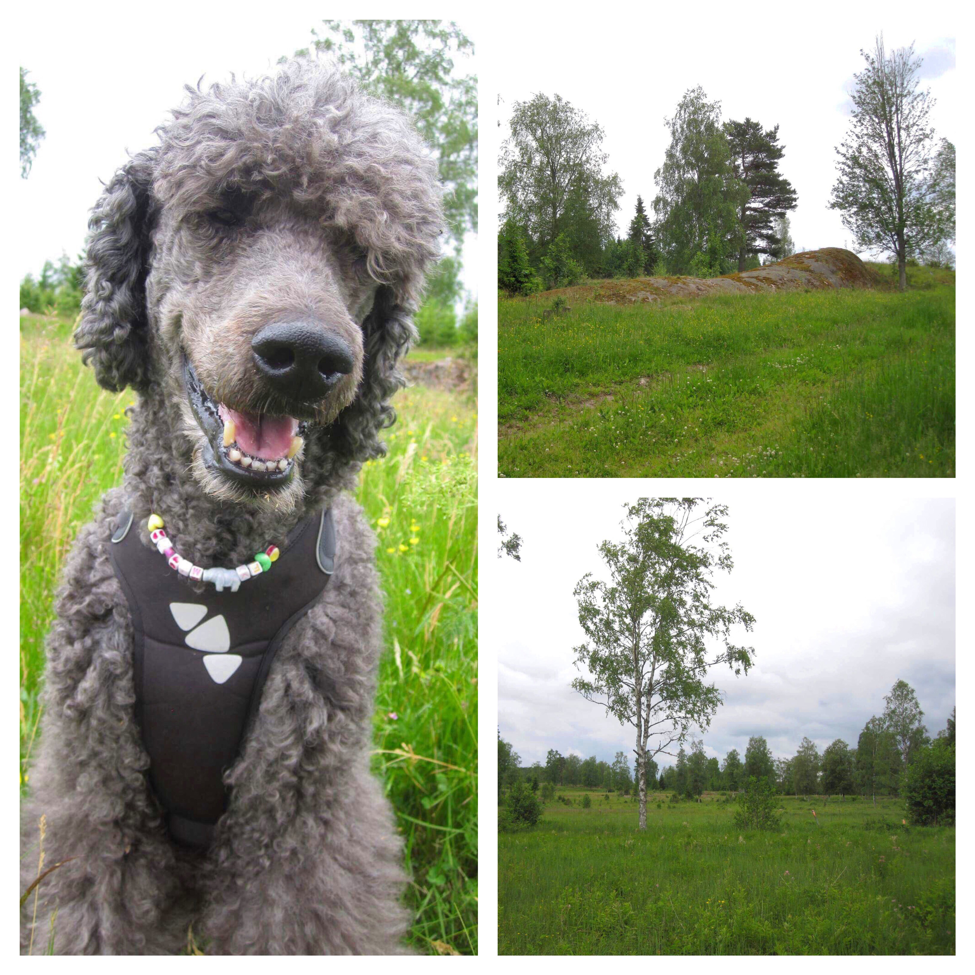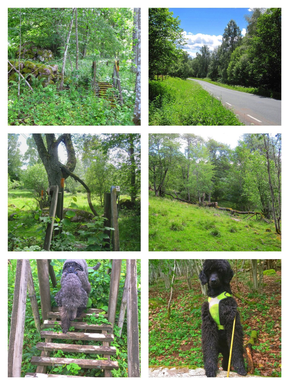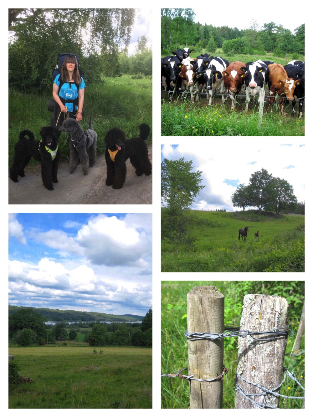 The first part of Aneby trail followed a country road. The sun was shining, but a cool breeze brought some releif as did the trees and their branches that stretched over the road. We passed pens with cows and horses, and while the cows were curious about us Charlie and Chiko were scared of them.