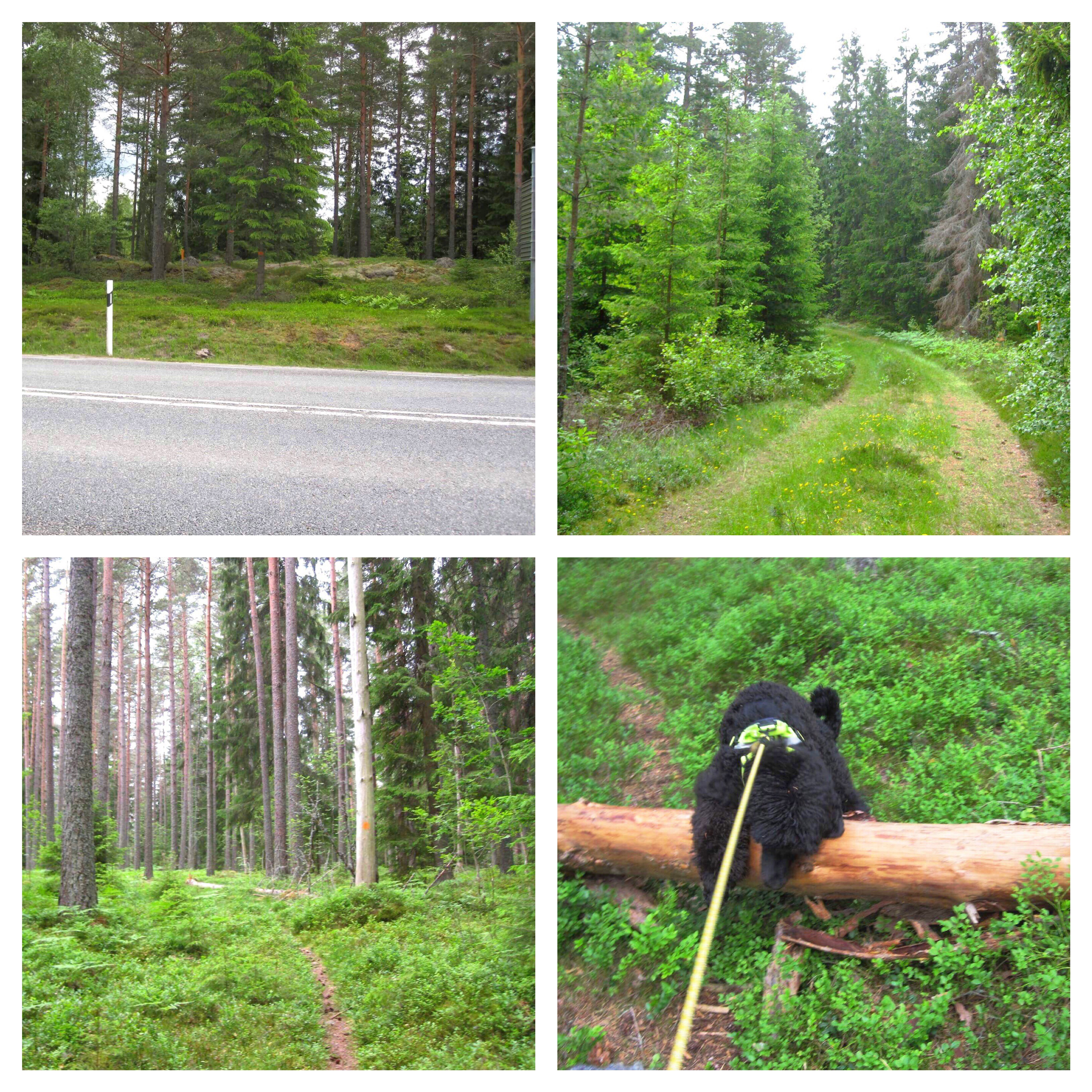 Snart nådde vi fram till en asfalterad väg som vi fick korsa, och kort därefter kom vi ut på en liten skogsväg, men efter ett tag vek leden av in i skogen igen. Här fick Chiko möta en omkullfallet träd om låg över vägen, och den problematik som tydligen kan vara förenad med att ta sig över en stock. Medan Oliver hoppar över trädet och Charlie först hoppar upp på stammen för att sedan hoppa ner hade Chiko en underlig metod där han skulle kliva över trädet med frambenen varpå han liksom blev hängande och fick kämpa för att få över bakbenen också. Men varför ska man göra det lätt för sig?