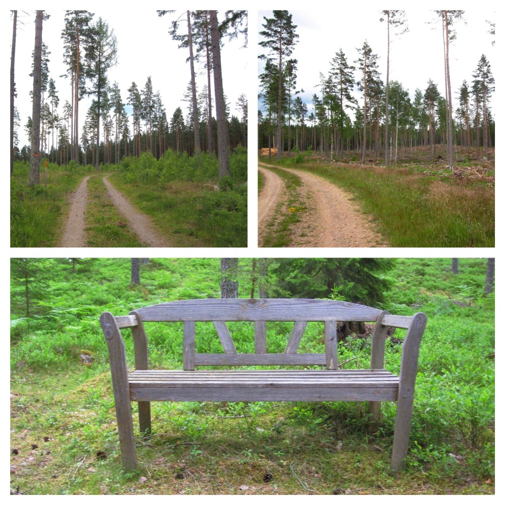 Så småningom nådde vi en till väg, och här fick vi passera ett avverkningsområde. Här hittade vi också en bänk som stod ute i skogen. Men ännu en stig följde, liksom ännu en väg.
