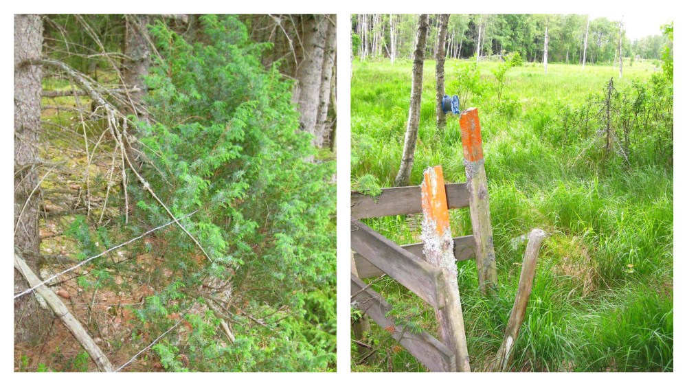 Leden tog av in i en tom hage, som ledde fram till ännu en tom hage. Sträckan som följde nu var inte helt enkel. Det fanns ingen grind till hagen, så det var bara att krypa under eltråden och klampa sig igenom våtäng. Vi skrämde upp ett rådjur, som skällande sprang in i skogen.