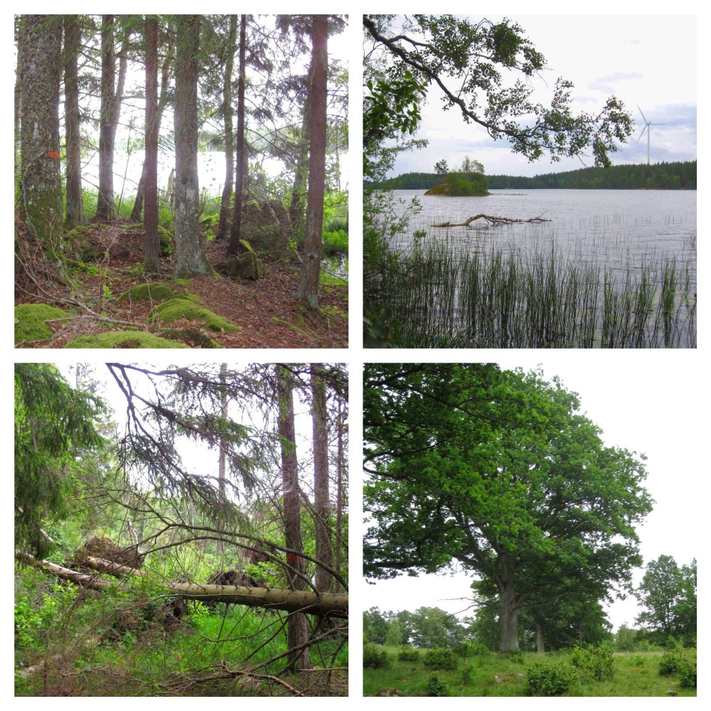 Here we continued through the forest, and soon reached the lake Kunhultasjön. The trail follows the shore, but you can’t walk there because of all the fallen trees. Before I had time to grasp the situation I stood there with the dogs and backpack, between falled logs and had no other choice but to once again crawl my way through. Not entierly easy with the ground being wet and covered with branches. To add one more cozy factor we heard the noise form a wind factory station the entire time. But eventually we got out from the mess and away from the lake and reached another pasture.