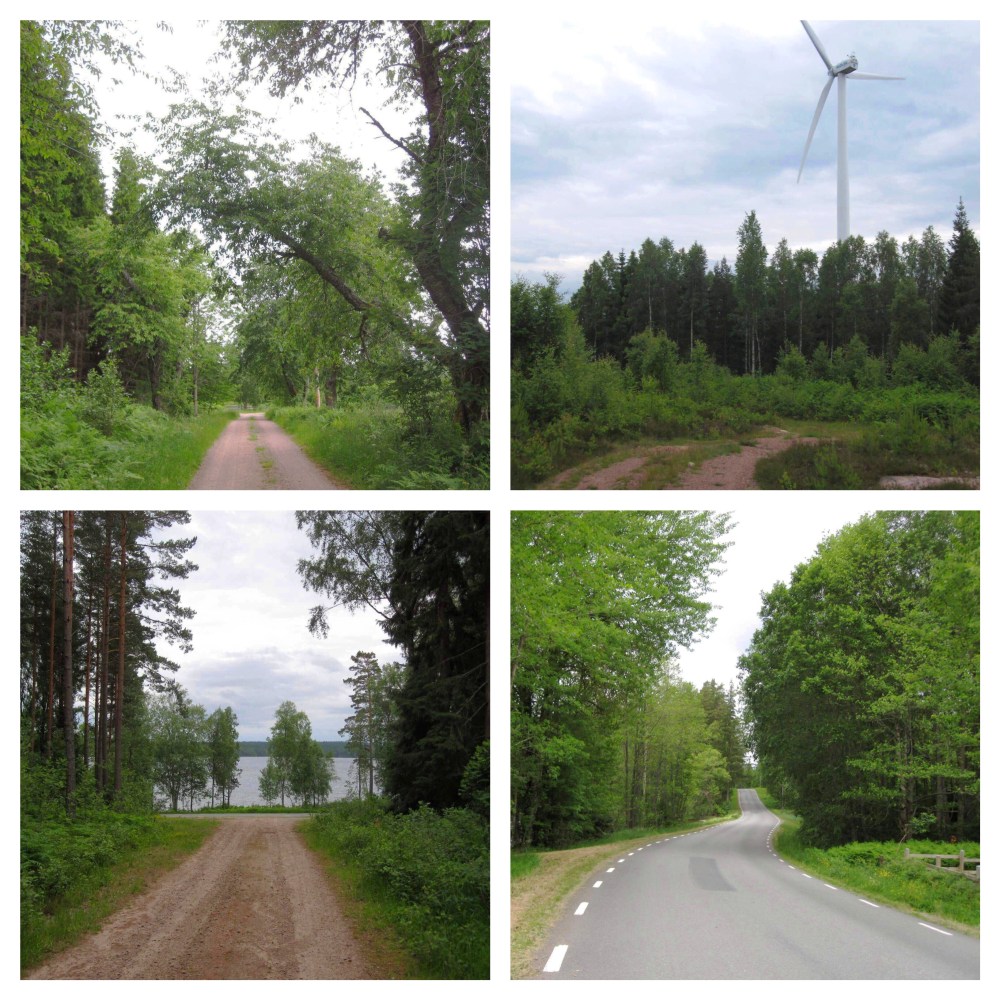 Vägen dit gick längs vägar, och vi passerade ett av vindkraftverken innan vi kom ner till en asfalterad väg. Då började det också att börja blåsa, och det kändes än mer angeläget att hitta en tältplats. Eftersom jag har lite lokalkännedom i området, så valde jag att gå till höger bort mot en badplats. Det var en chansning, men jag gissade att eftersom det både blåste, skulle regna till kvällen och vägen också var avstängd längre fram på grund av ett vägarbetsbygge så skulle ingen bry sig om att åka och bada på kvällen.
