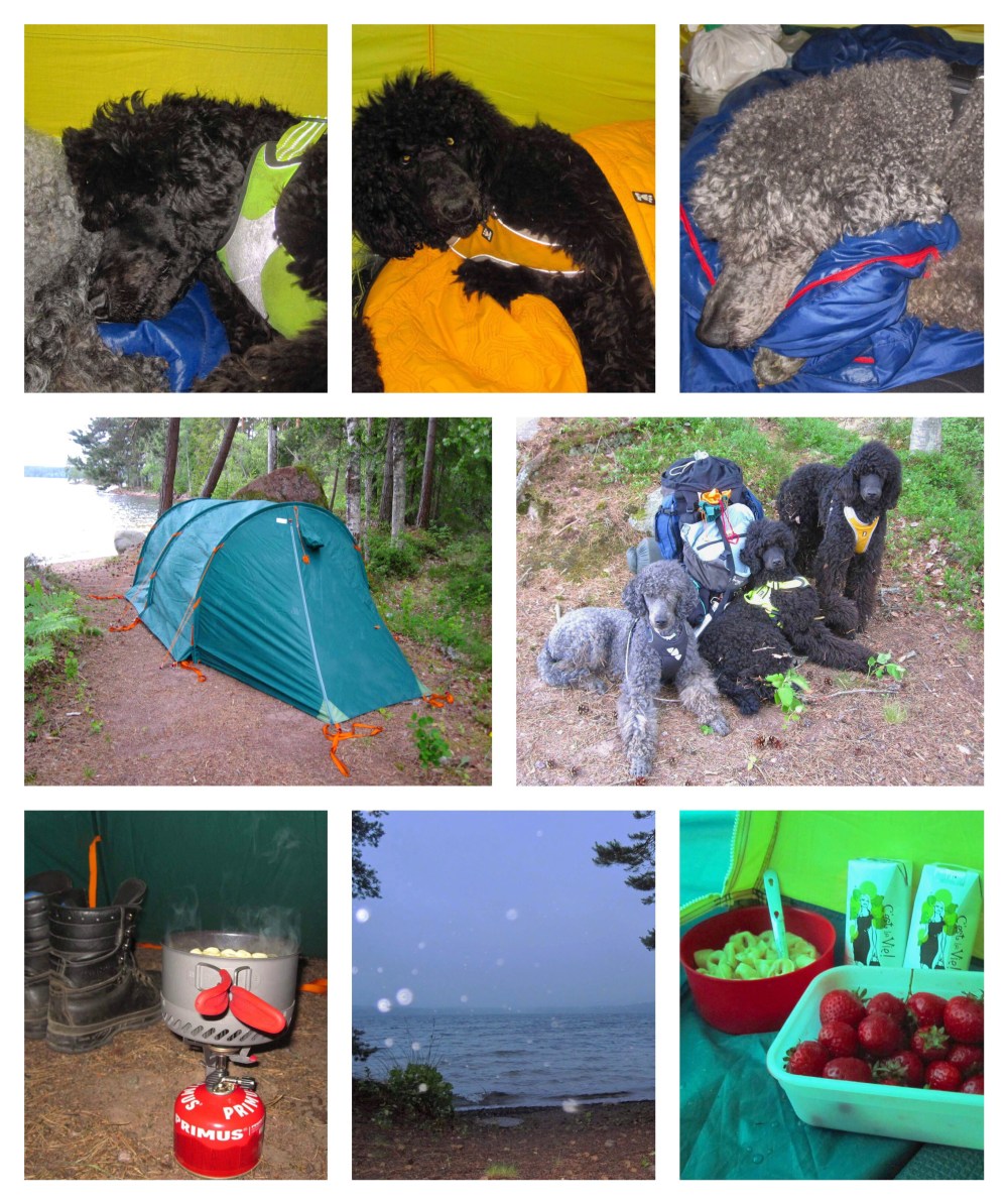 Och mycket riktigt. När vi kom fram så var badplatsen tom och jag fann mig en plats att slå upp tältet på. Precis när jag fått upp det så tilltog vinden än mer och det började att störtregna. Det blev till att laga mat i absiden, men det gjorde egentligen ingenting. Hundarna var helt utslagna, och det var mysigt att lyssna på vinden och regnet.