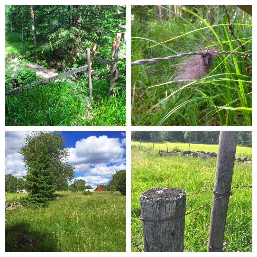Vi kom ut på en väg, och fick njuta av mer lantlig idyll. Men snart tar leden av in i hagar, fast vart leden viker av var svårt att avgöra. Nu följde en sträcka som jag hade haft svårt att reda ut om jag inte hade haft en app i telefonen som visade både leden och vart jag gick. Med telefonen i handen lyckades jag något så när följa leden genom hagar och snårig skog, och förbi taggtråd.