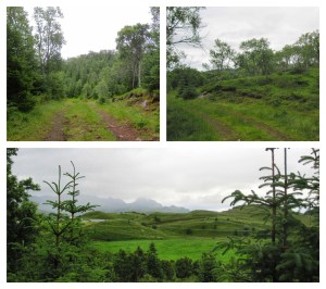 Vägen går genom granskog. Granskogen är speciell här på Lofoten. Den är odlad, men skogsbruk är inget som praktiseras på Lofoten. Skogen står därför och sköter sig själv, och ser väldigt malplacerad ut där den växer på sluttningarna till fjällen. Men det är mysigt att gå på en väg genom skogen.