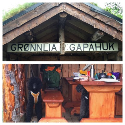 The wind shelter, Grønnlia Gapahuk, is situated a stone’s throw away from a mountain stream leading to a lake. There were also benches and a fire ring for a valp fire. The wine shelter is fenced in to keep the sheep out. It was nice, because the Boys could saunter around as they pleased.