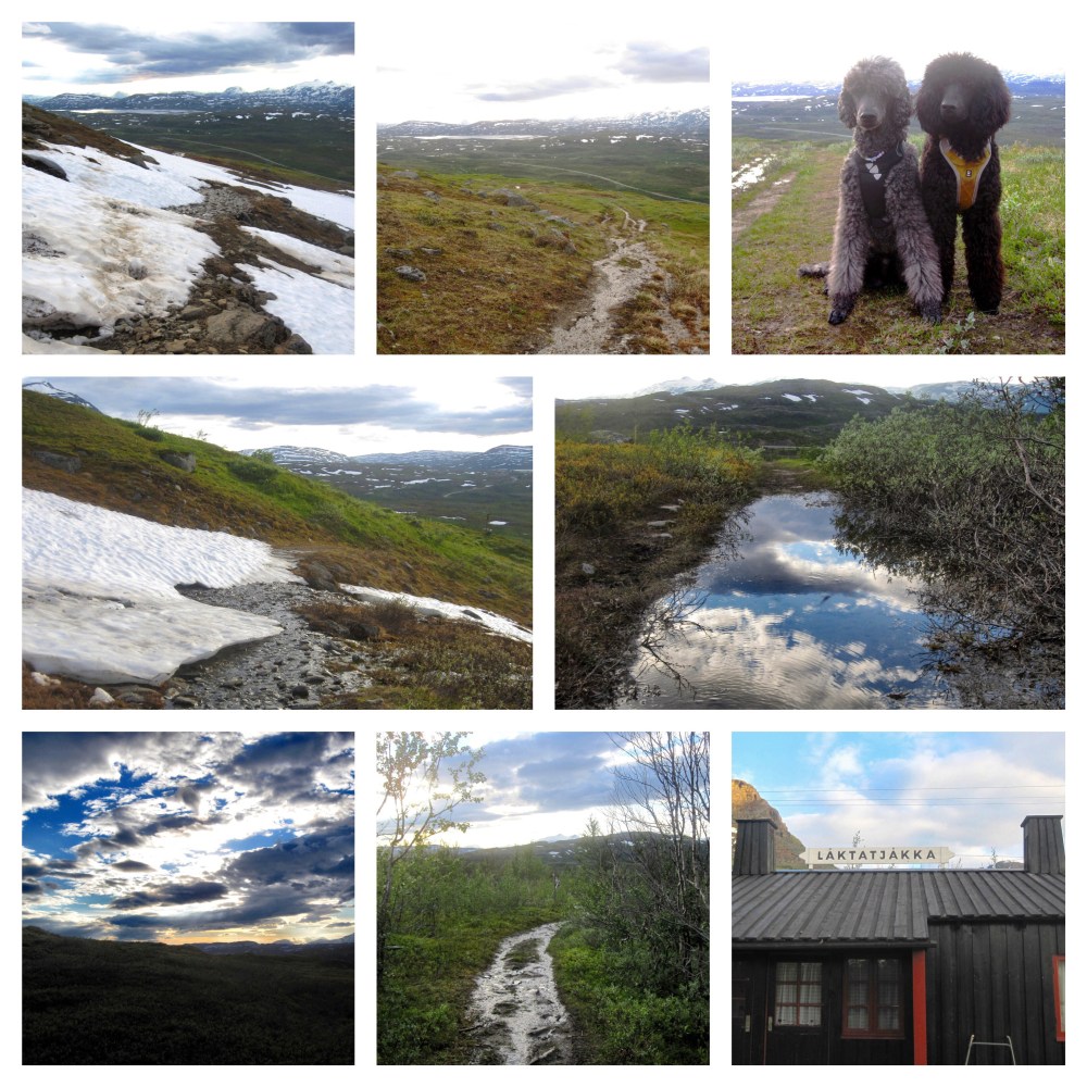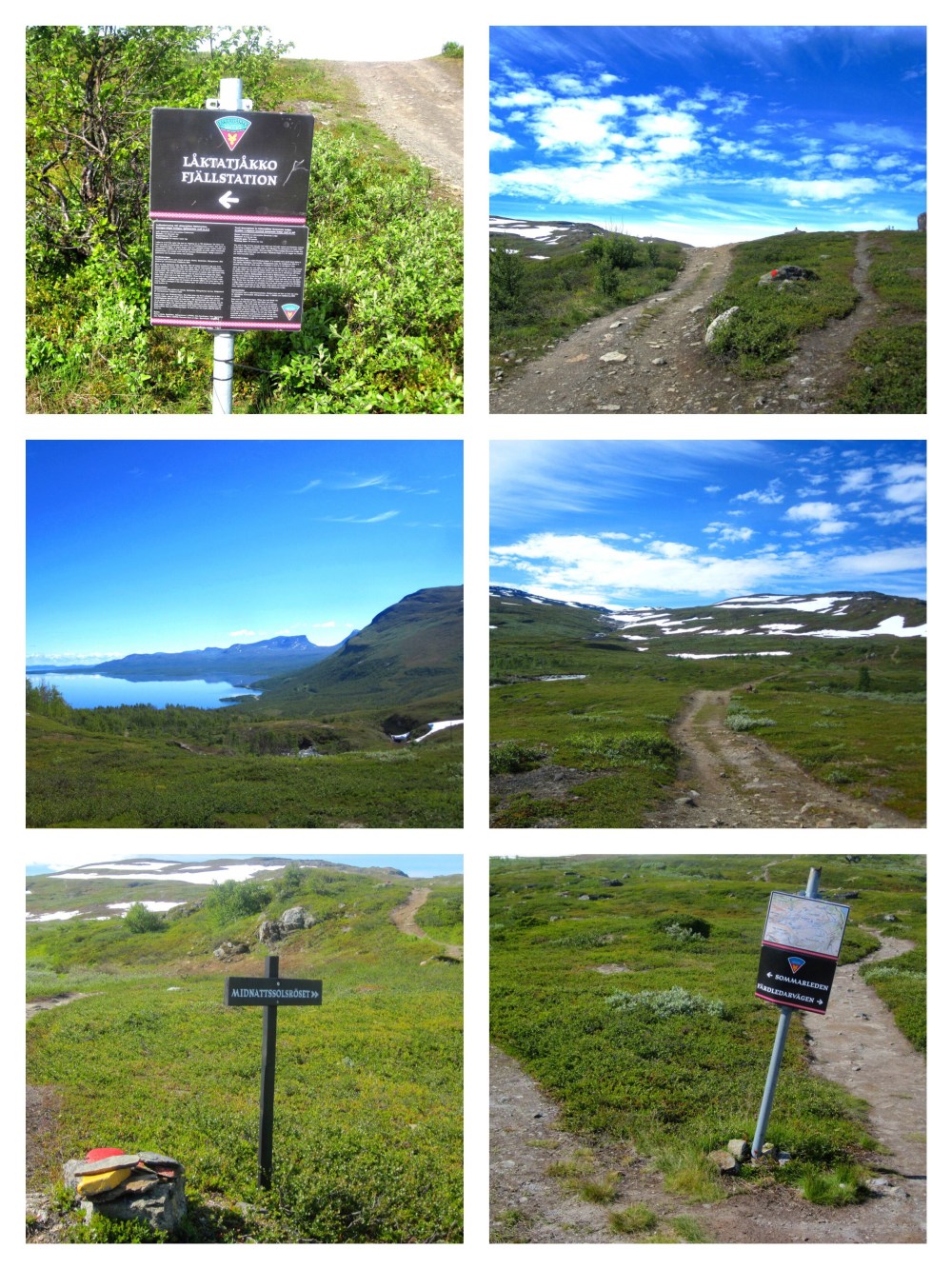 När leden återigen började att plana ut sig, och en distansskylt informerade om att det bara var 3 kilometer kvar till Låktatjåkko fjällstation hade renarna vandrat vidare åt ett annat håll. Det gick inte längre att få en skymt av Torneträsk, och det var en storslagen känsla att befinna sig omgiven av fjäll. Men huvudvärken spände allt mer, och jag insåg att en av solen utlöst migrän var i antågande. Därför tog vi paus igen, och jag tog ett par smärtstillande tabletter. Migrän uppe bland fjällen var inte ett äventyr jag ville vara med om.