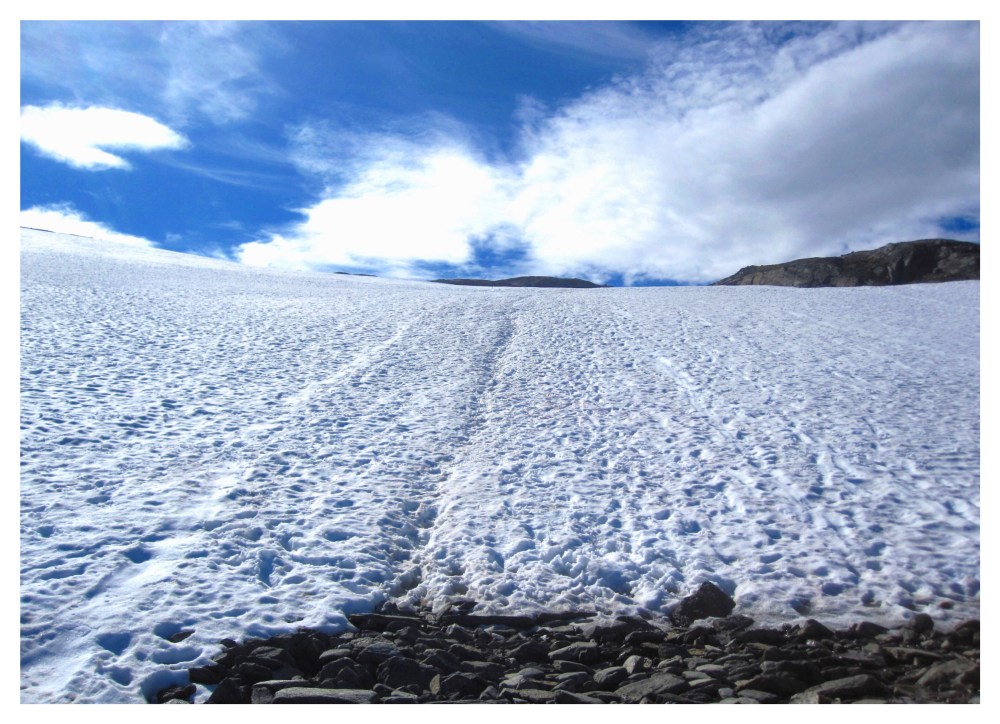 Det låg mycket snö på fjällen runt omkring oss, och smältvattnet rann ner till fjällplatån där vi befann oss. Snart kom vi fram till en av fjällsidorna. Den var brant och helt täckt med snö, och över den sken solen direkt ner på oss. En huvudvärk hade börjat trycka bakom ögonen, och kroppen kändes låg på energi. Vid foten av fjällsidan satte jag mig ner vid ett par stora stenar och packade upp lite fika. En liten sockerkick torde råda bot på både huvudvärk och trötthet tänkte jag.
