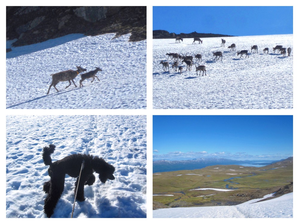 Långt bort på ett snöfält fick jag plötsligt syn på en stor hjord renar. Detta var första gången som jag fick se renar uppe på fjället, något som jag glatt och uppspelt berättade för Oliver och Charlie. De brydde sig inte nämnvärt, de märkte inte av renarna på det avståndet och var upptagna med att navigera sig fram mellan stenar, genom lera och vattendrag.