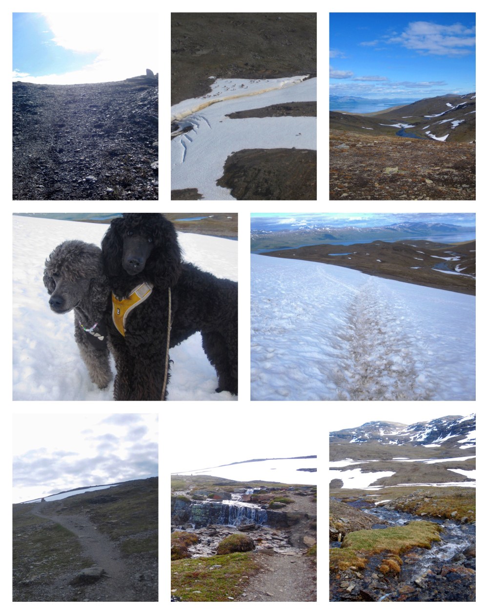 Vi fortsätta upp för fjället, och det låg snö fläckvis omkring oss. Perfekt för att kyla ner hundarna med. Medan hundarna åt snö kunde jag gnida in snö i deras päls, och på Oliver lät jag snön ligga kvar på ryggen. På det sättet fortsatte vi, och efter att vi tagit oss upp för ytterligare ett par branta och steniga partier började leden plana ut sig.