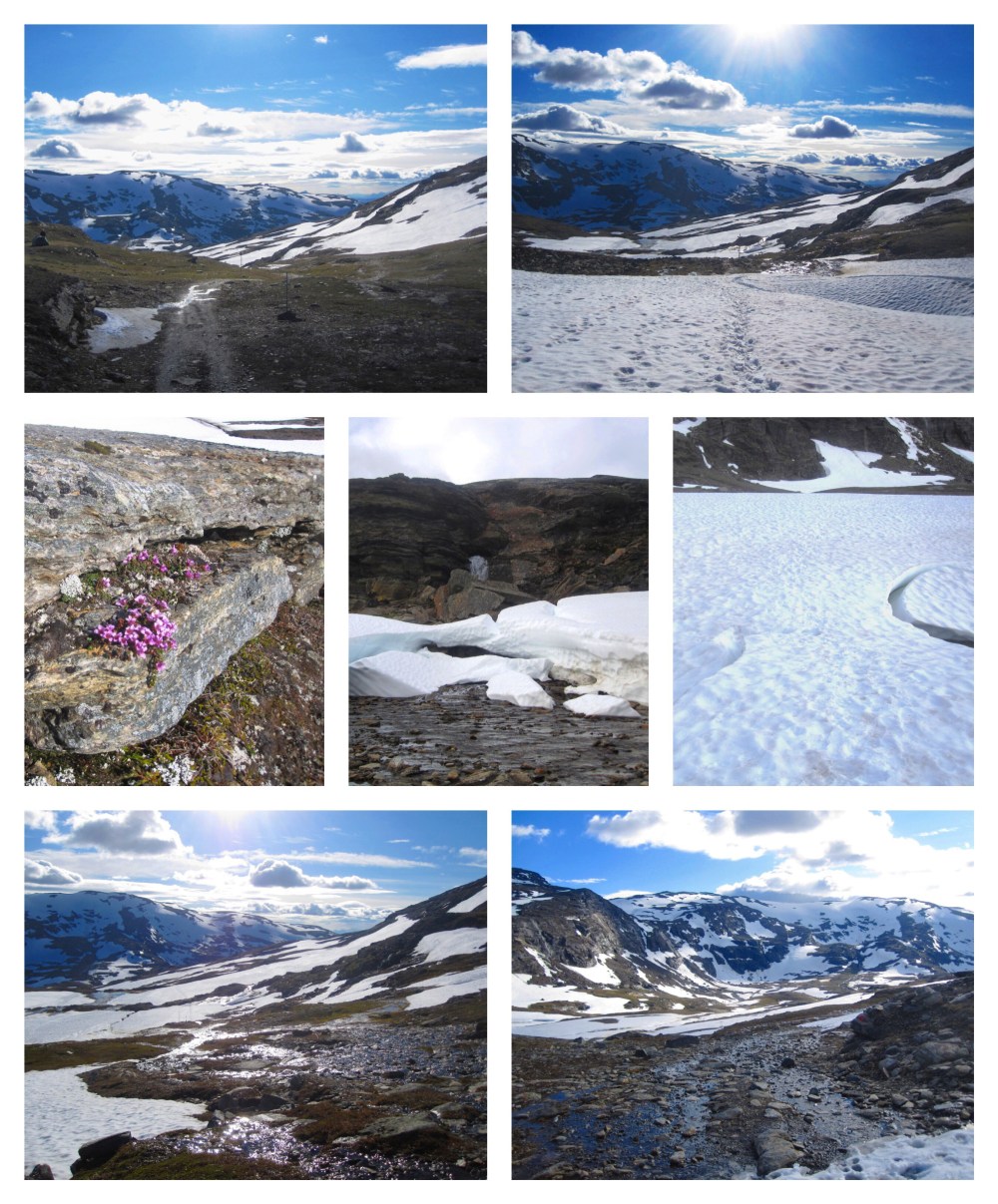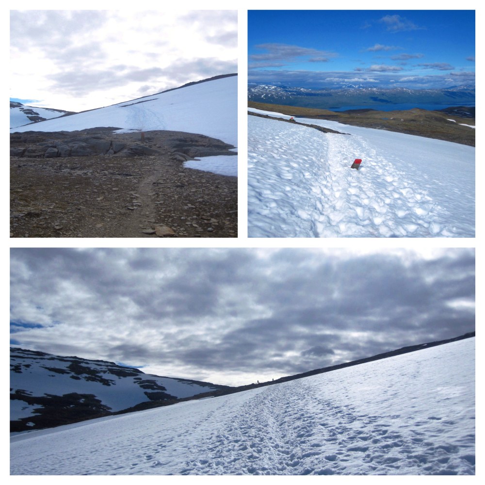 De sista snöfälten var jobbiga att gå igenom. På några ställen var det bara ett skal av skare kvar, och nästan ingen snö alls under. Det var lätt att trampa igenom och då stå med ett ben i ett hål som gick upp till knät, men det var inte heller alltid helt lätt att navigera runt eftersom det var brant och halt.