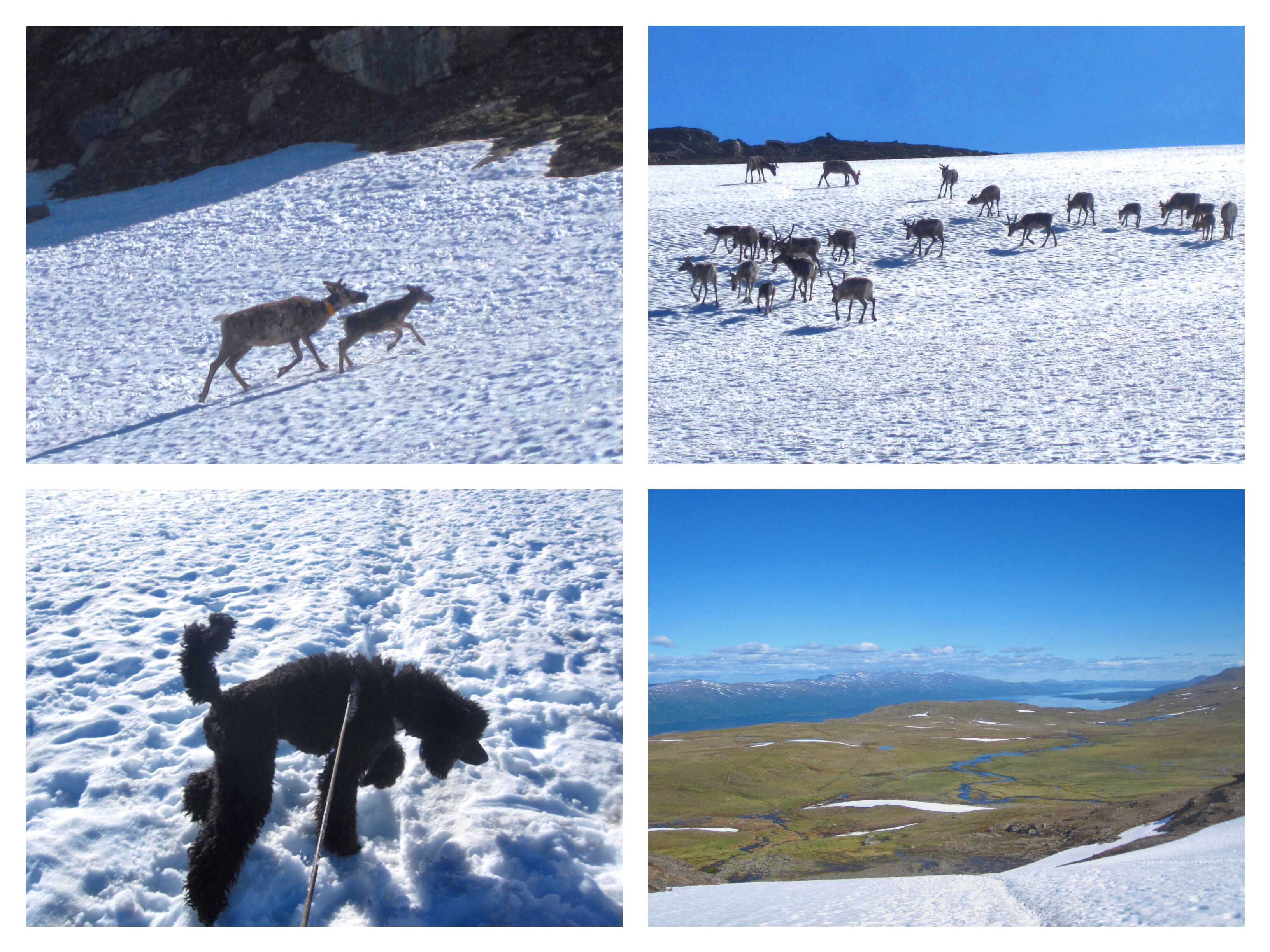 Tabletterna gav snart effekt och vi fortsatte. En bitvis brant stigning började nu, och efter en stund kunde jag se små prickar mot snön långt bort. Det var renarna som fortsatt sin vandring på andra sidan av en jokk. Vi fick passerade ett par vattendrag, och snart stod vi inför ett snöfält.