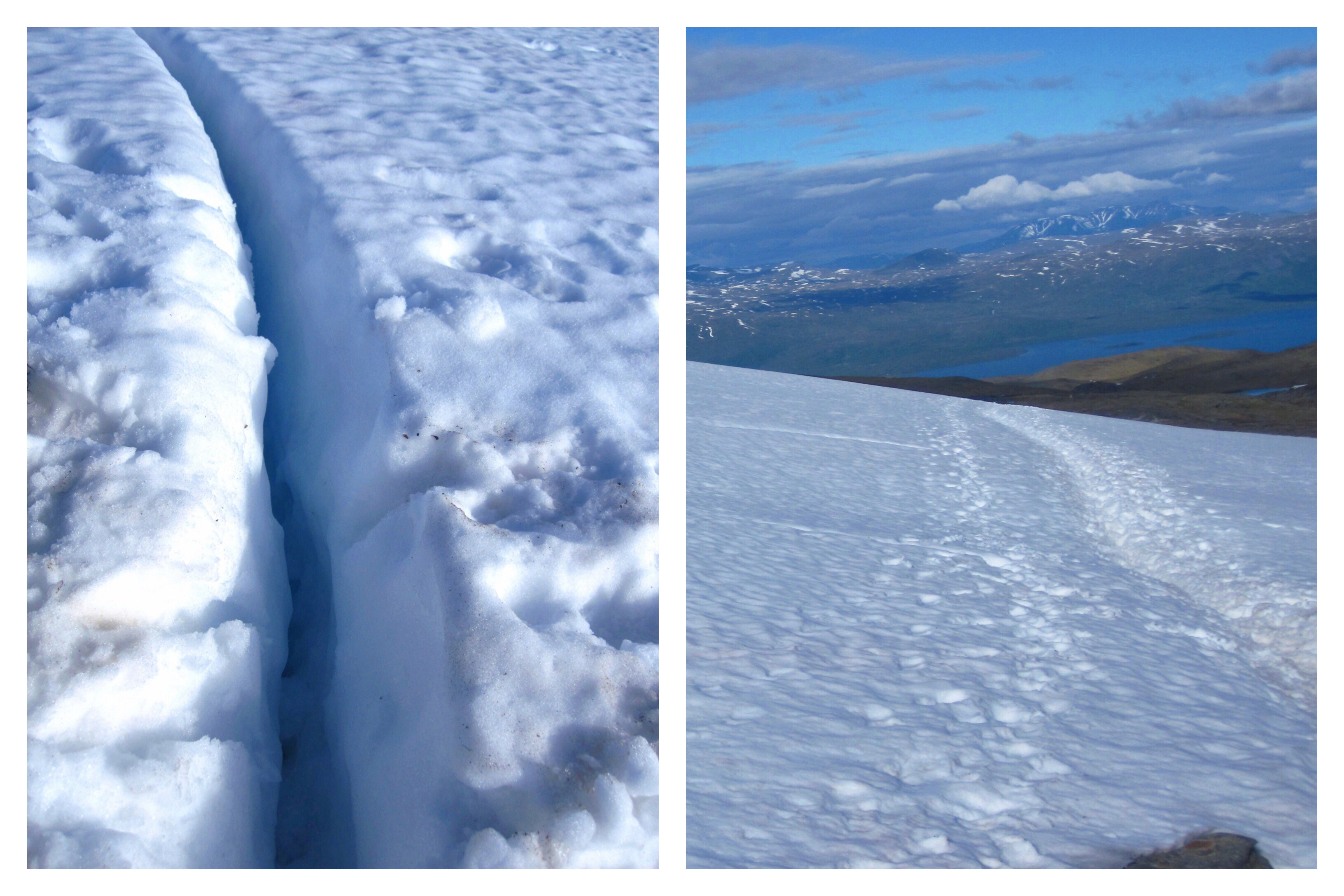 De sista snöfälten var jobbiga att gå igenom. På några ställen var det bara ett skal av skare kvar, och nästan ingen snö alls under. Det var lätt att trampa igenom och då stå med ett ben i ett hål som gick upp till knät, men det var inte heller alltid helt lätt att navigera runt eftersom det var brant och halt.
