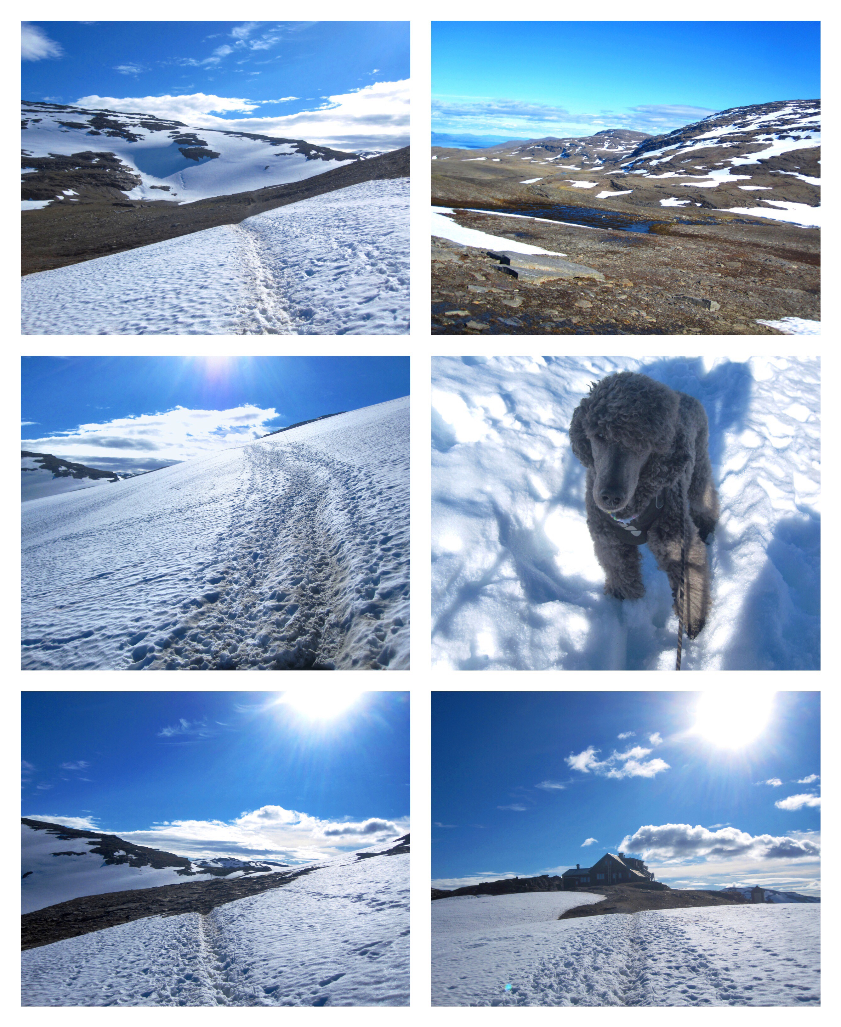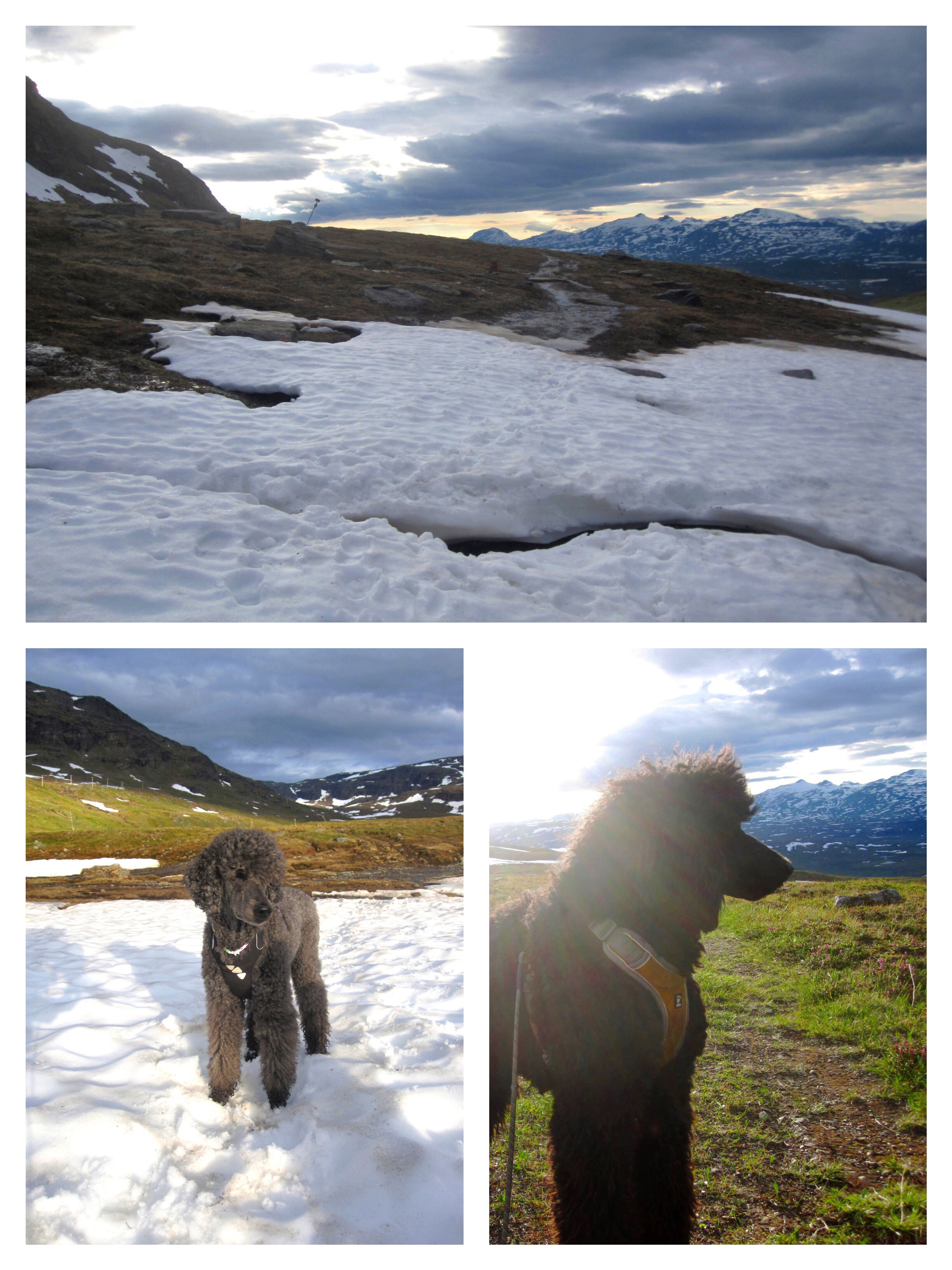 Vi fortsätta upp för fjället, och det låg snö fläckvis omkring oss. Perfekt för att kyla ner hundarna med. Medan hundarna åt snö kunde jag gnida in snö i deras päls, och på Oliver lät jag snön ligga kvar på ryggen. På det sättet fortsatte vi, och efter att vi tagit oss upp för ytterligare ett par branta och steniga partier började leden plana ut sig.