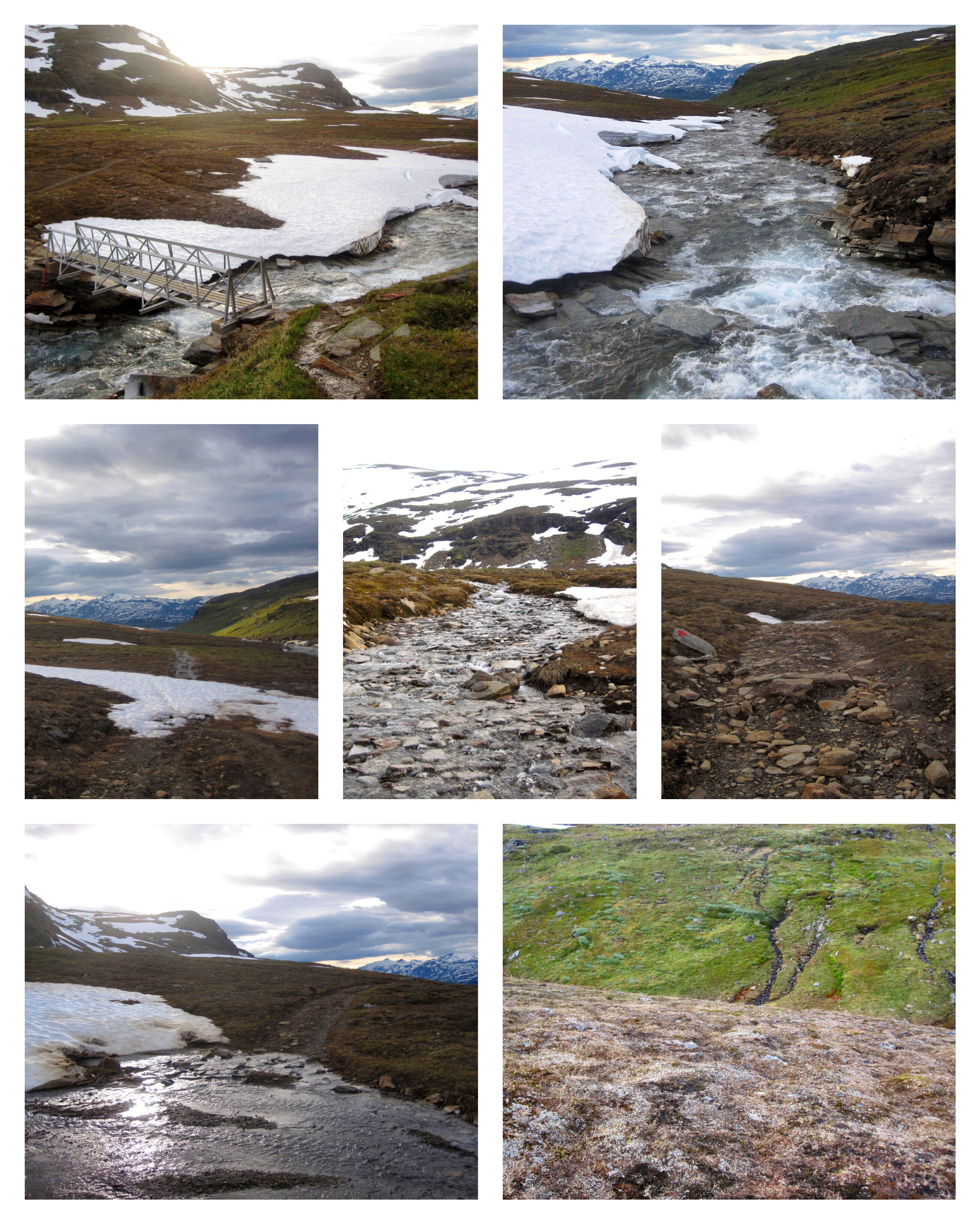 Efter en stund fortsatte vi. En bro ledde oss över jokken, och nu gick leden igenom genom partier med snö och smältvatten. Det hade nu hunnit bli kväll, och kvällssolen sken vackert mellan molnen som nu samlats på himlen. Det slog mig vilka konsekvenser årets sena snösmältning hade på växtligheten. Förutom att det var väldigt blött så var all växtlighet där det legat snö brun och vissen, medan fjällsluttningarna på andra sidan jokken som var helt fria från snön lyste gröna i jämförelse.