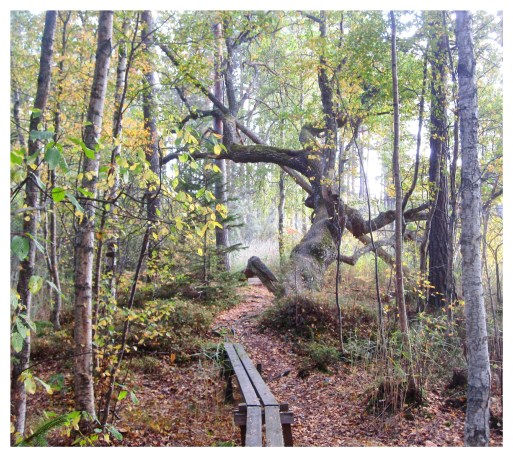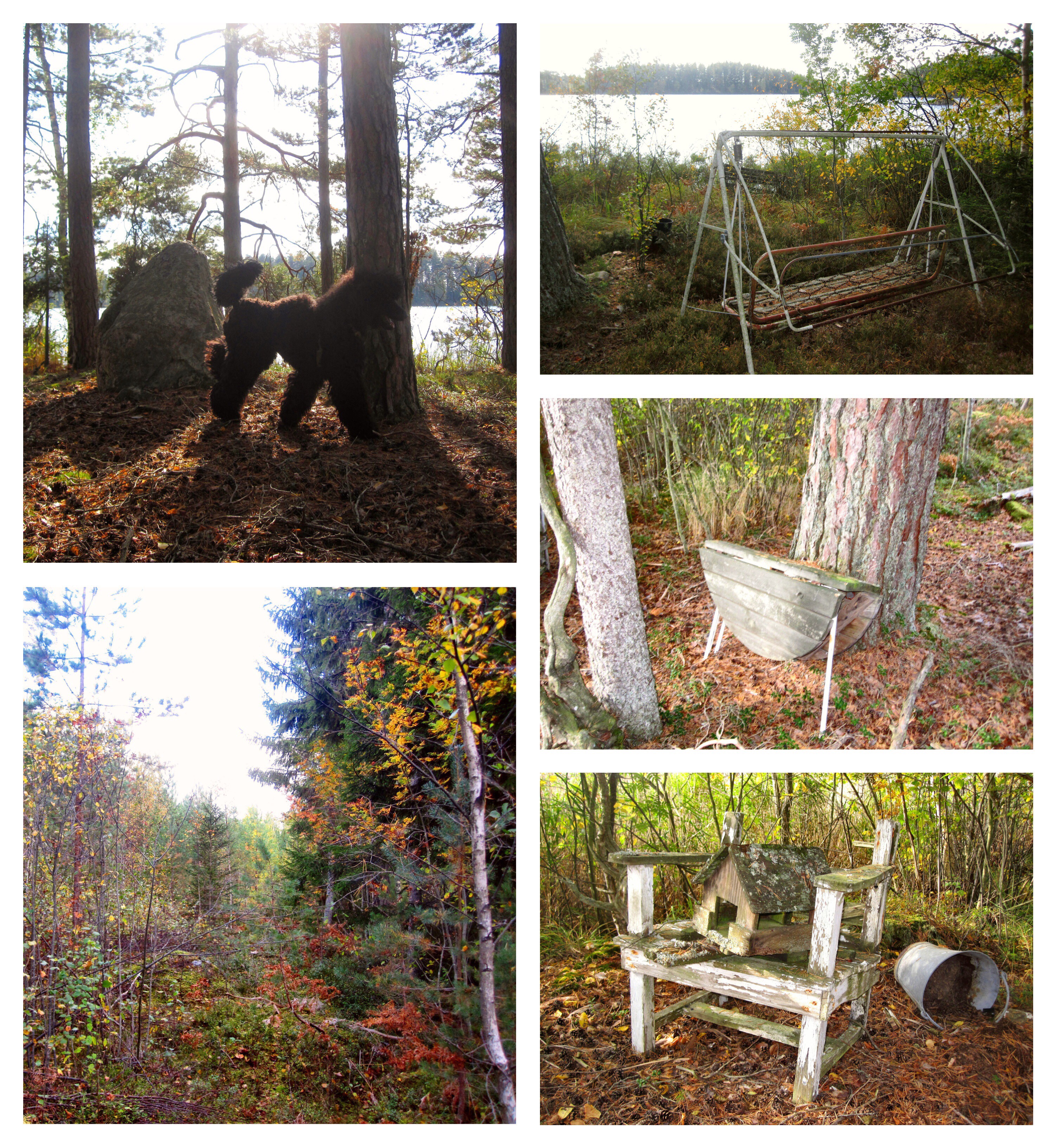 The sun was shining, which brought out the nature’s autumn colours. We reached a small point of land where it would have been nice to set up a tent, and continued along a path to a place where old furniture stood abandoned. They did not look as if they had been dumped. A bench and a garden swing stood facing the water and a table was leaning against a tree, so it has probably been a place to which people probably have come to enjoy themselves, but it looked as if it had been some time since anyone had last been there.