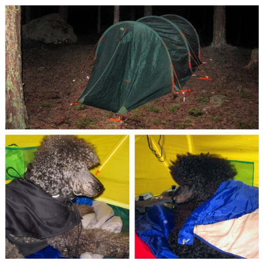 Hundarna låg nedanför vindskyddet och värmde sig vid brasan, och Charlie fattade tycke för att tugga på små kolbitar. Varför de smakade så gott har jag svårt att förstå, men de var tydligen en delikatess och han blev snart expert på att hitta varenda liten bit som trillat ut från brasan. Så småningom drog vi oss tillbaka till tältet. Med tanke på att det började bli kallt om nätterna hade jag, istället för hundarnas Hurtta Outback Dreamer som bara en hund ryms i, med mig en extra sovsäck som jag kunde öppna upp och bädda ner båda hundarna i. Oliver var däremot som vanligt ovillig att ligga nerbäddad, och la sig sonika ovanpå sovsäcken.