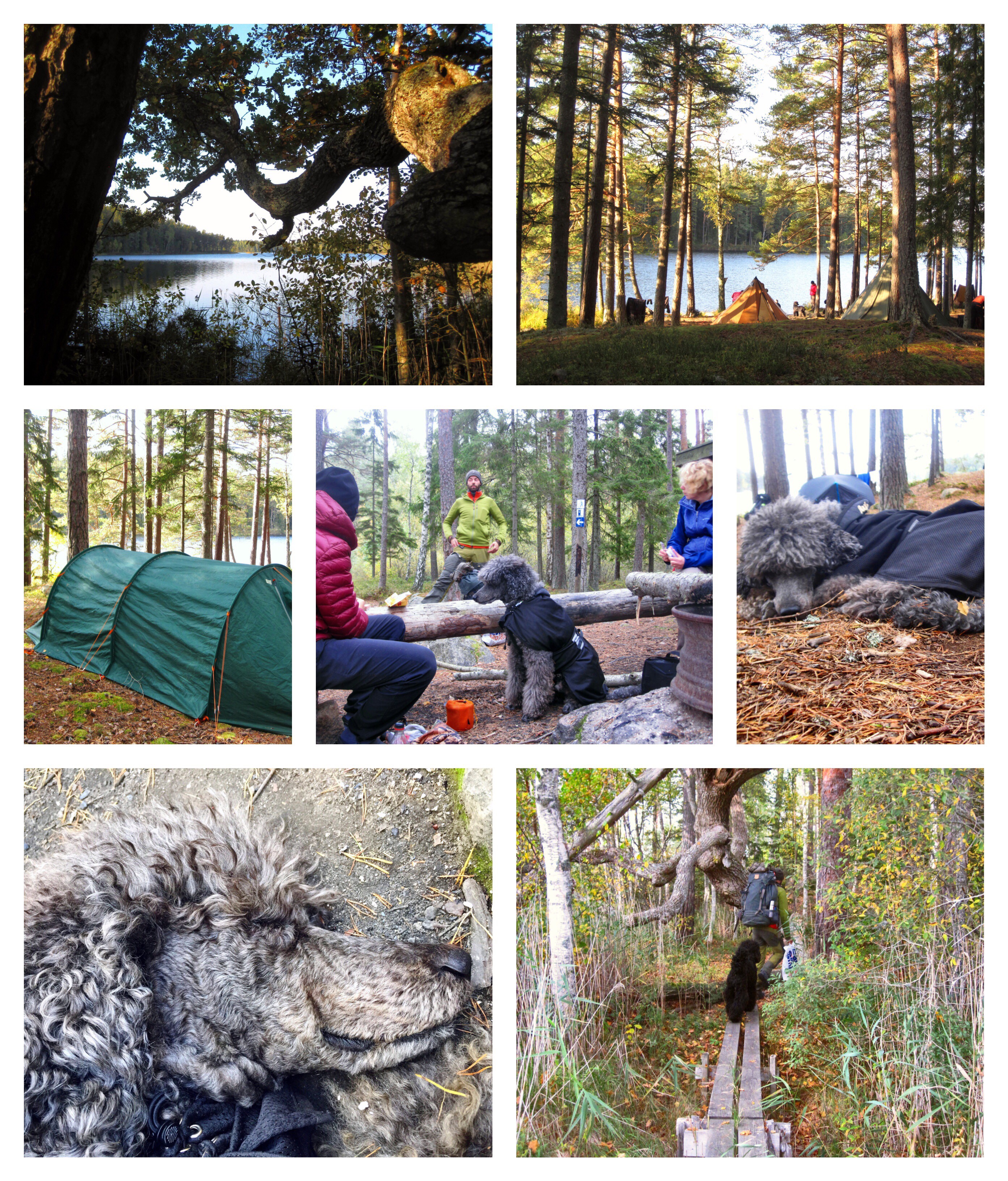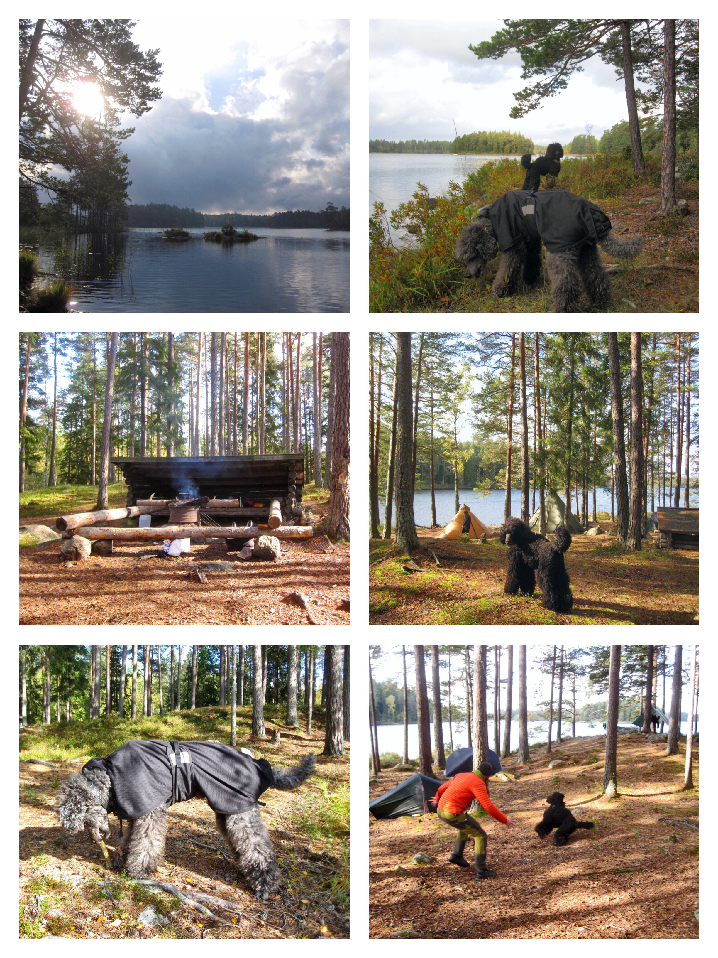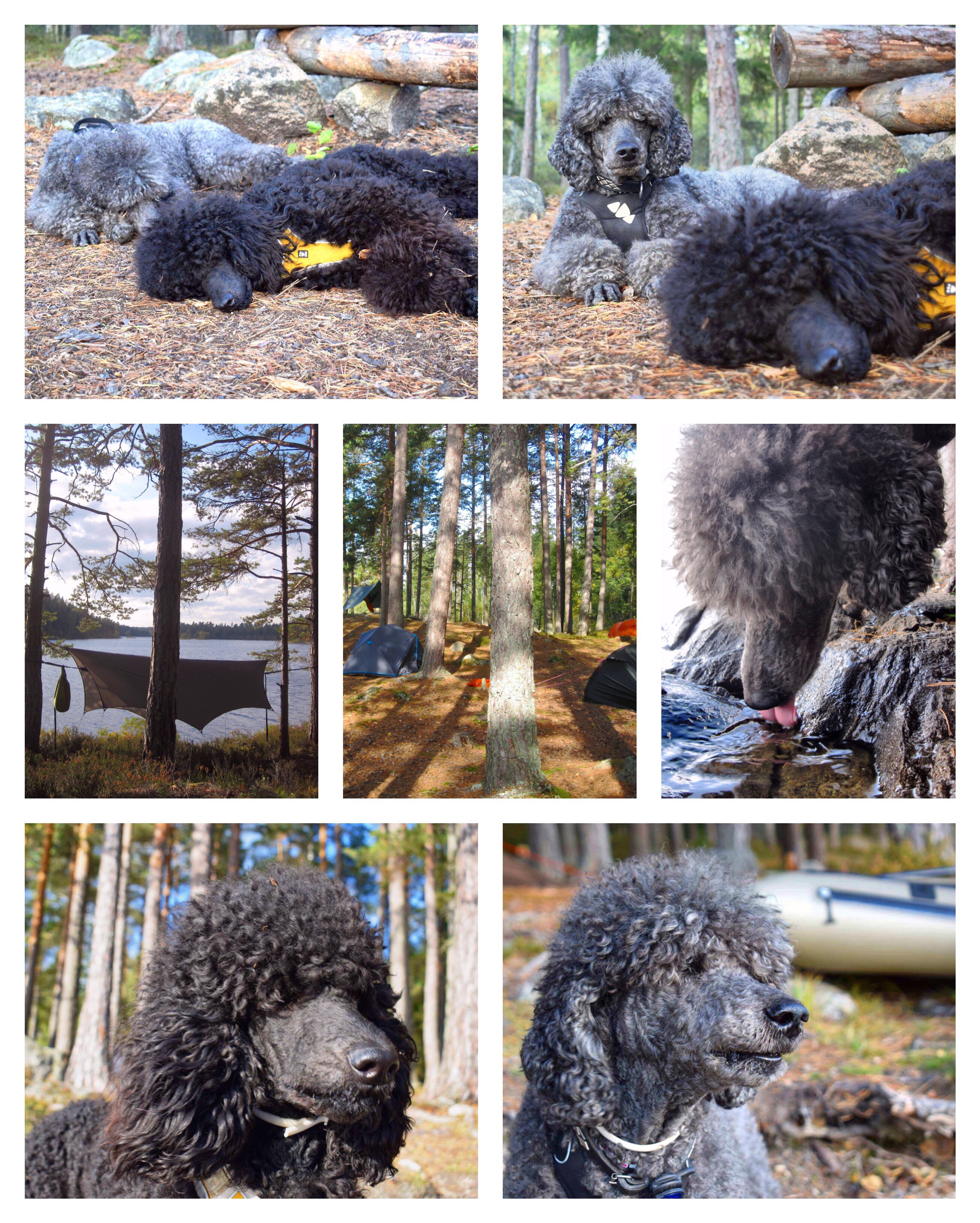 The dogs were tired when we got back. They laid down to rest while I sat in the shelter to have a fika. Afterward, we walked a little among the tents and hammocks before ending up on a rock by the water. It was a beautiful afternoon, and it was very serene to sit there by the water talking, with the dogs sauntering around or resting and the sun glittering on the water.