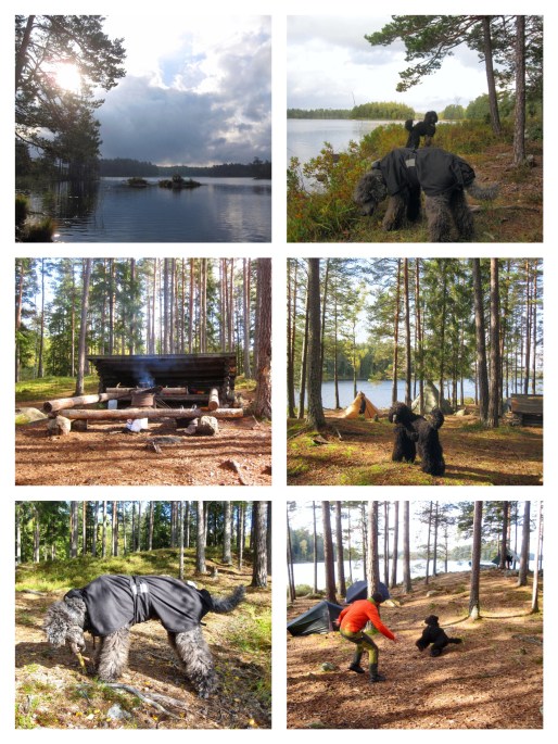 Kvar på land var stod nu bara jag och hundarna, tillsammans med två kompisar. Vi drog oss tillbaka till vindskyddet, och jag och hundarna åt frukost. Därefter gick jag och tittade på de olika tälten och hammocks medan hundarna lekte. Charlie rusade runt som en galning och lekte med allt och alla, men Oliver hade också en massa uppdämd energi och förvånade de andra när även han deltog i leken. Jo då, den gamla gubben kan han med.
