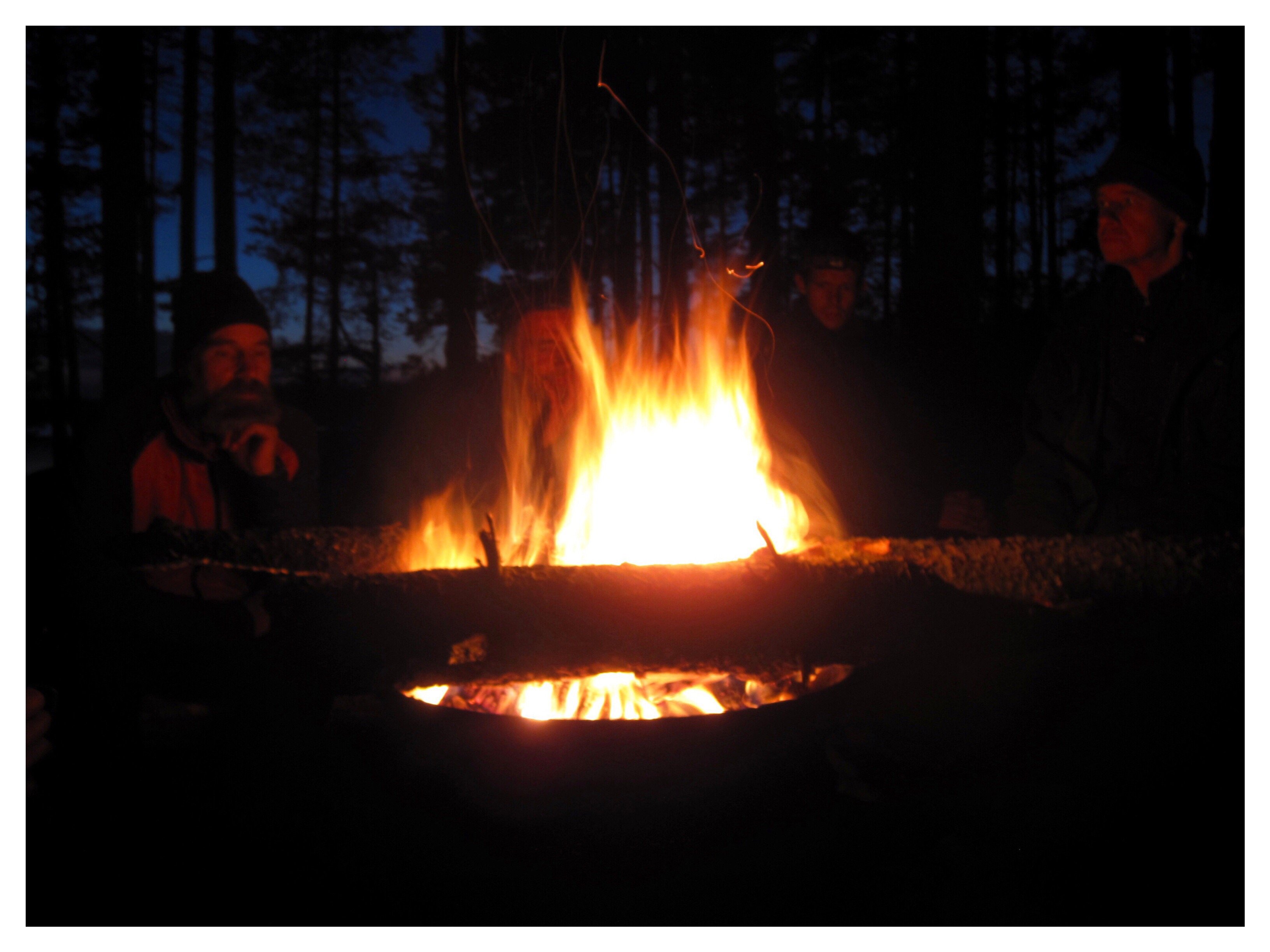 Väl tillbaka på land sökte vi oss till brasans värme för att göra sällskap med de andra och torka byxor. Även om vi suttit med kjol i packraften så var vi blöta om rumpan. Men fördelen med funktionskläder är att de torkar snabbt.