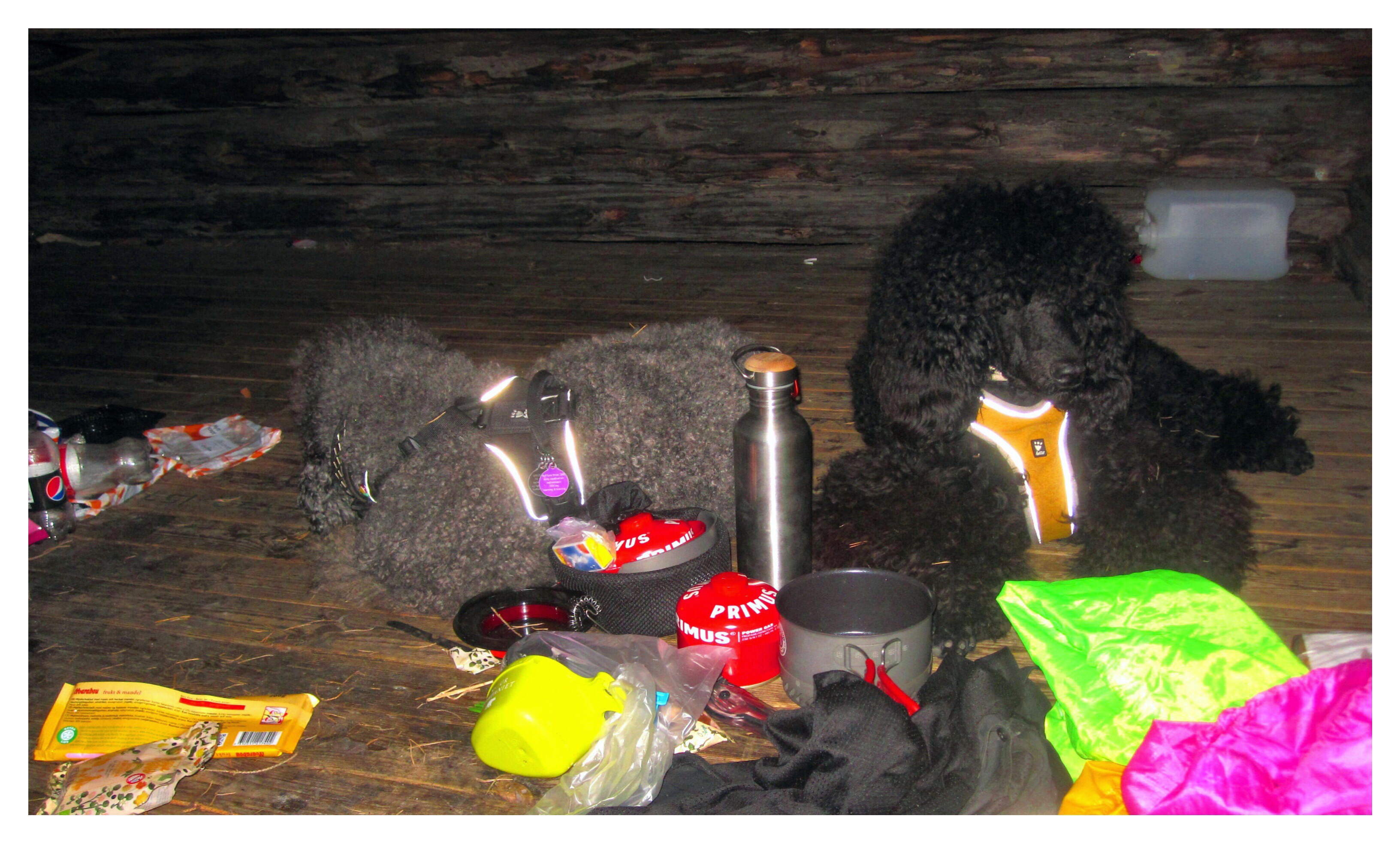 Det var en mer öppen stämning runt brasan denna kväll. Alla hade inte möjlighet att stanna en natt till, men vi som var kvar satt länge och pratade om packrafting och friluftsliv i allmänhet, och om mycket annat också. Däremot blev det lite drama när det sprätte glödande kol ur brasan och landade på textilföremål och i Charlies päls. Stanken från bränd päls var fruktansvärd, och från de kolbitar jag plockade ur Charlies päls hängde smält päls. Det verkade som att det var tur att han hade lång päls. Den gjorde att kolbitarna inte kom nära huden och brände honom, och annat än svedd päls så blev det inga skador. Han själv verkade inte ens märka av att han hade kol i pälsen, men båda hundarna fick lov att flytta upp i vindskyddet för säkerhets skull. Oliver var väldigt motvillig till att flytta sig från brasans värme och den plats där han låg och sov, men jag var rädd för att det nästa gång skulle ta eld i någons päls.