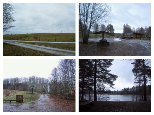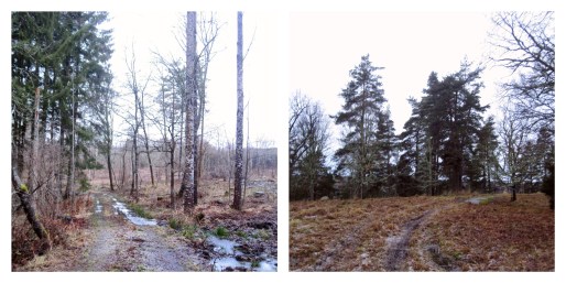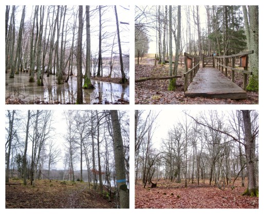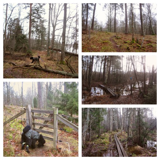 We continued from the bathing place through the forest to a gate leading into a pasture. There were no animals in there, but at this time of the year I would have been surprised to meet any. A foot bridge led over the wettest sections, but it was still very muddy at times.