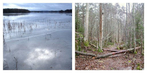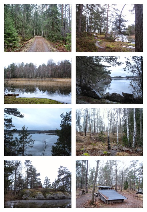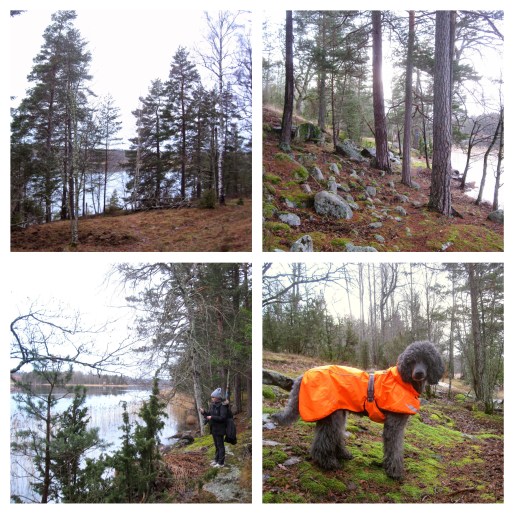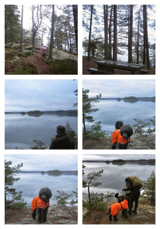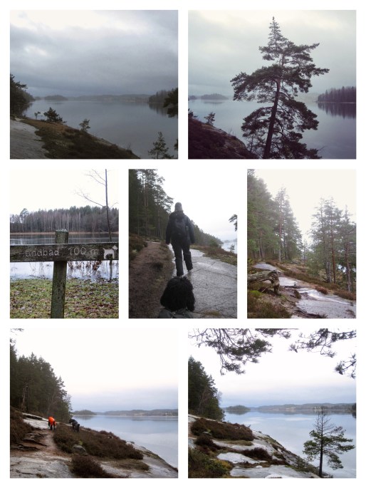 We reached a point of land with a picnic table. From there we had a beautiful view over the lake. I believe Viggeby must be a popular place to visit in the summer, and we met several dog owners. We were a bit surprised by that, we had thought that there would not be many people out on a cold and rainy Sunday.