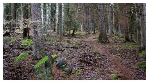 Stigen fortsatte bort från vattnet och upp i skogen. På flera platser kunde vi se de skador vildsvinen orsakar på marken när de bökar, och vi kunde också se klövavtryck i leran. Vi var fortsatt lite nervösa över att råka på vildsvin, vi gick när allt kom omkring på en halvö och resonerade att ytan vildsvinen hade att gömma sig på var begränsad, och därför gick vi och sjöng några snapsvisor för försäkra oss om att vår närvaro inte gick obemärkt förbi.