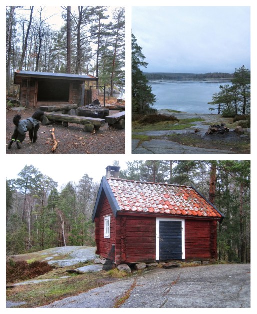We reached a narrow country road, and discovered that the Östgöta trail goes through here, and for a short distance we followed the Östgöta trail before the Viggeby trail continued into the forest. The trail winds its way through the forest and back to the water. It follows along the water until it reaches Jaktstugeudden (= the name translates to ‘the point of land with the hunting lodge’), a place with several shelters, fire pits, privies and a cute little red resting lodge.
