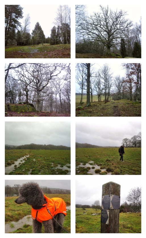 Till slut nådde vi fram till ett par klippor där det växte en stor ek, och marken blev genast torrare. Stigen fortsatte över klipporna och ner till en stor öppen betesmark. Här var det inte lika lerigt, men däremot väldigt blött.