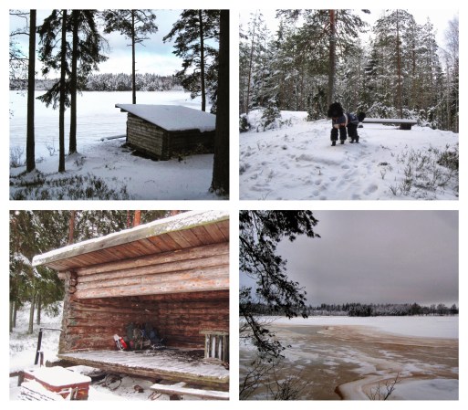Under bilfärden hade Oliver hunnit torka. Från bilparkeringen gick vi ett par hundra meter längs leden innan vi kom fram till vindskyddet. Det ligger vackert beläget vid en sjö och har en stor eldstad. Vi ställde vår packning i vindskyddet och sopade ut alla snö med en träslev som fanns i vindskyddet. Jag bäddade därefter iordning med liggunderlag och sovsäckar till mig och grabbarna, och bytte till varmare täcken på dem. Även om Oliver hade torkat i bilen så visade det sig att de två täcken han hade på sig fortsatt var fuktiga.