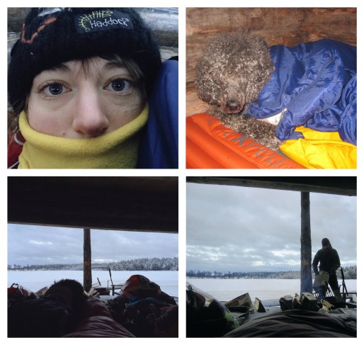 Så småningom blev det dags att sova, och vi la ordentligt med ved på brasan. Jag bäddade ner hundarna ordentligt innan jag kröp ner i mina dubbla sovsäckar. Natten blev kall, och när vindarna tilltog kändes det som att de drog rätt igenom sovsäckarna. När jag vaknade på morgonen hade Charlie lagt sig mellan mig och Oliver, och hade inget annat än sina täcken som värmde.