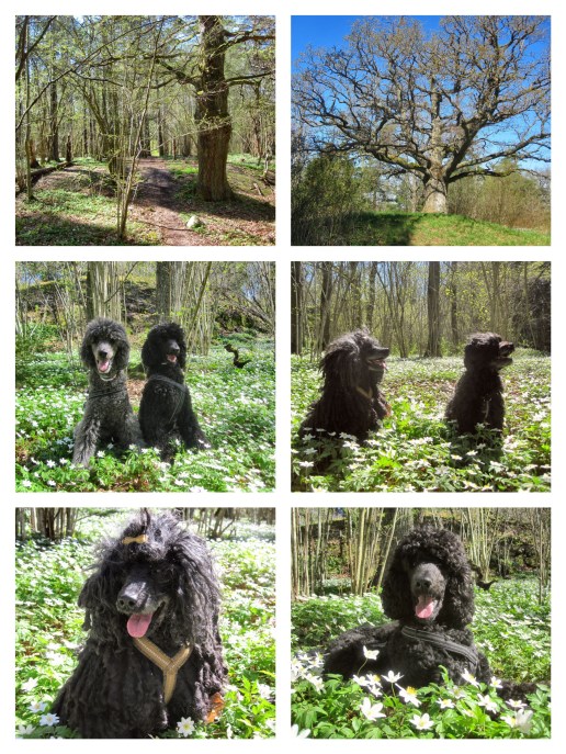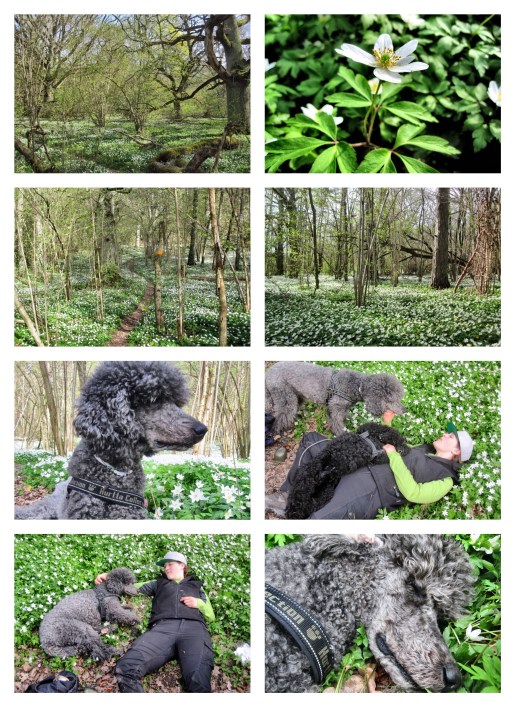 It was a warm day, there were barely any clouds in the sky. We kept a slow pace for Oliver’s sake, but to be completely honest it was not only for him; there was a sea of wood anemones covering the ground. There was also a rather unpleasant smell that we could not identify; it smelled both as if something had died and laid rotting and like a sewer. But despite the smell we enjoyed the wood anemones to the fullest, and we stopped to arrange the dogs amongst the flowers for photographs.