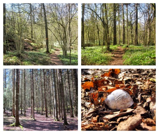 We remained sitting amongst the wood anemones for some time before we headed off again. The unpleasant smell was back and between the trees we could see that we were close to the tarps; we thought that perhaps the smell came from whatever lay underneath them. Eventually the deciduous forest gave way to pine forest, and the rest of the trail followed paths and a paved road.