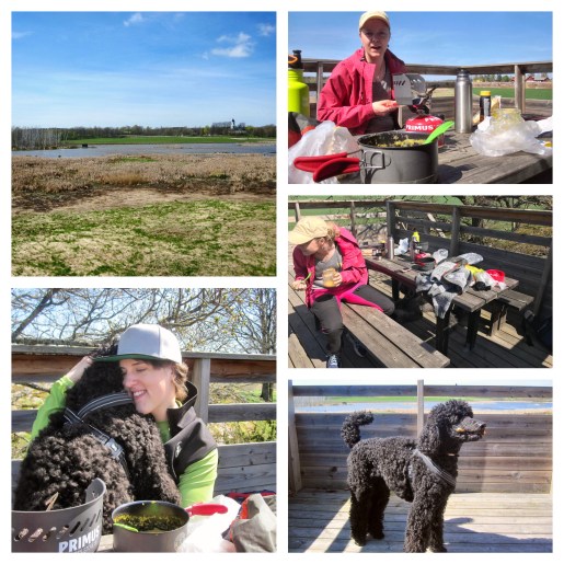 The bird watch tower is built in a pasture, but there were no animals there that day, but the barbed wire makes be believe that the pasture might be used for cattle. There is a picnic table up in the bird watch tower, and we decided to have lunch there. I was a bit nervous walking up the narrow and steep stairs with Oliver because loss of coordination is one of the problems he has suffered after his latest relapse, and my friend was concerned that her dogs would not be able to make the stairs because they were not used to that type of stairs at all; they all did fine however.