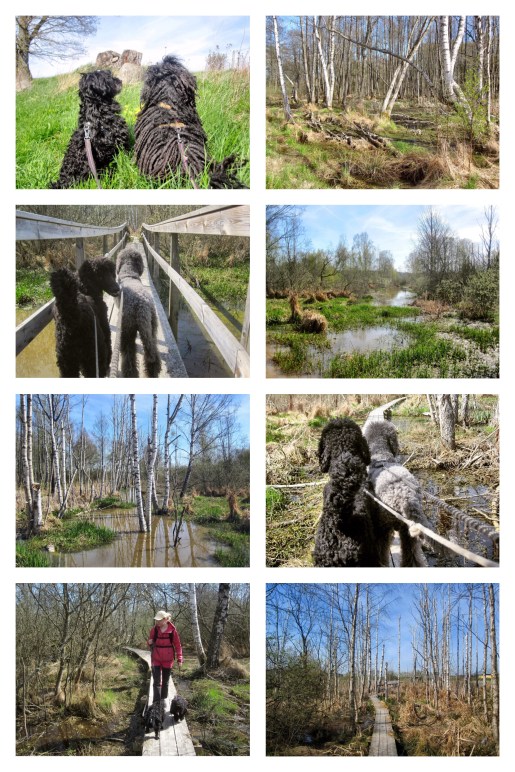 Det är alltid lika spännande att se hundarna gå på en lång spång och se om någon av dem ska få för sig och trängas så den andre åker ner. Nu var jag dessutom lite orolig över att Oliver skulle få sig en knuff och tappa balansen, men det gick bra. När vi gick över bron till gömslet såg vi en liten stig som svängde av, och vi blev nyfikna på vart den skulle leda så nu när vi var på väg tillbaka bestämde vi oss för att följa stigen. Den gick genom ett våtlandskap och ledde strax ut på en grusväg. Följer man grusvägen till vänster kommer man tillbaka till stigen som leder till Klockaretorpsleden.