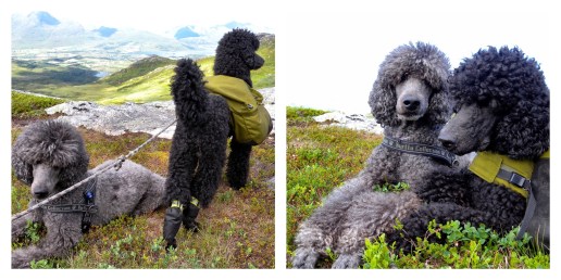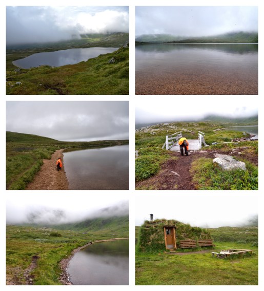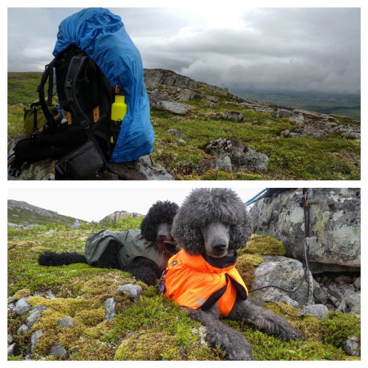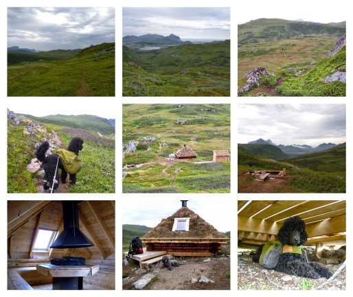The day was a bit cloudy, and we continued along a path leading down to the valley Slydalheia. We met a group of hikers from Italy, and they told me I was approaching a lapp cot. The lapp cot turned out to be new, it had been built the previous year. We stopped there, and I sat my backpack down outside by the stairs with the dogs before I went inside to have a look. When I came back outside I could only see Oliver; Charlie was nowhere. But his leash was still tethered to the backpack and I could not for the life of me understand how he had managed to get loose; it was a couple of panic stricken seconds before I discovered that he had crawled underneath the stairs and actually was still on his leash.