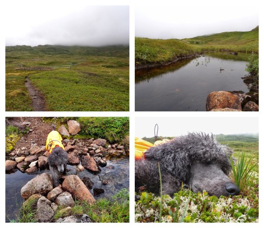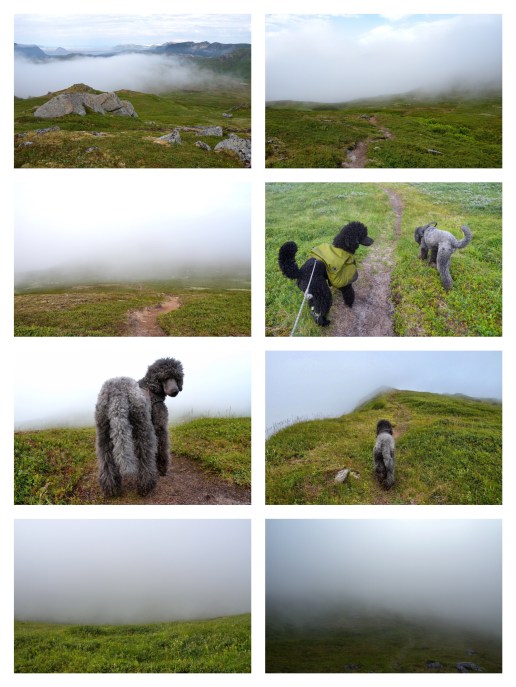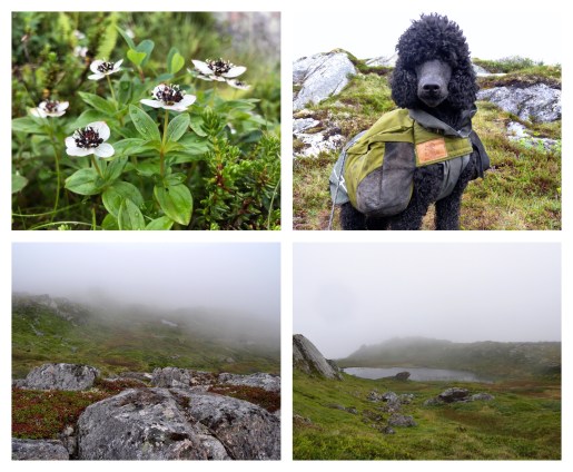 Det var många fårstigar som gick här, och det var ibland svårt att avgöra vad som var stigen vi skulle följa och vad som var fårstig. Men jag tog sikte på fjället vi skulle fram till och gick ditåt. Vi stannade till vid en stor sten och satte oss där för att äta lunch och vila. Medan vi satt där började luften att bli kyligare, och jag kunde se ett tjockt moln av dimma som närmade sig fjället. Men jag lät hundarna vila, i värsta fall kunde vi ju slå upp tältet där vi var. Det verkade däremot som att dimman inte drog åt vårt håll, så när hundarna vaknade till liv igen så så fortsatte vi.