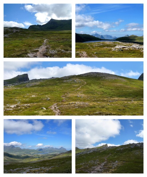 When we walked down from Kartstaven it was at first a bit tricky to find the trail again, but after a bit of searching we did find it. At first the path followed along the steep side of the mountain and it was a bit of a relief when it began to flatten out. It did not last for long however, soon there was a steep descend down to the valley between the mountains Kartstaven and Blåtinden. From there the path ascended again.