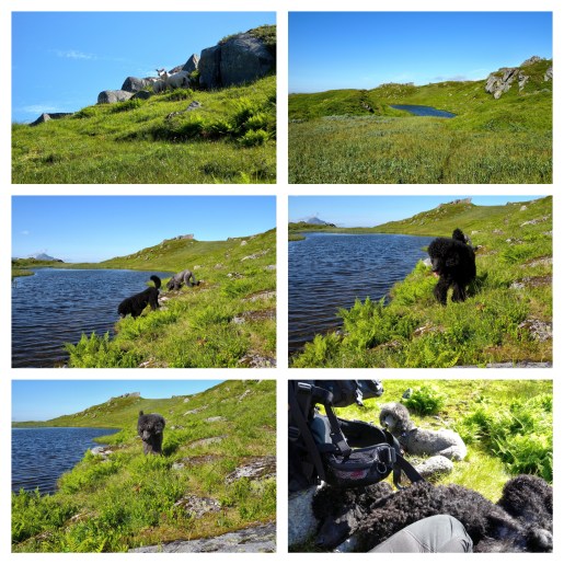 It is taxing to walk up and down in this steep landscape, so when we reached a pond I sat down on a stone to rest. The dogs quenched their thirst, and then Charlie came and literally threw himself down into my lap and promptly fell asleep. Oliver laid down a bit further away and soon he was also fast asleep.