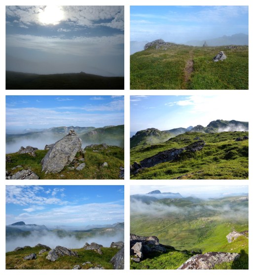 By then the fog had eased a bit, and the sun was beginning to shine through the white blanket that had enveloped us. You need to have respect for the fog in the mountains. It can become so thick that you can not see a thing before you, and in the mountains of Lofoten it is easy to accidentally walk over a steep slope or cliff; even though you are following a path as mentioned earlier. If the fog becomes so thick that you cannot continue safely you need to stay where you are until the fog eases. We were lucky that the fog did not get that thick.