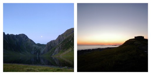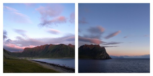 In August the midnight sun has come and gone, but you can still enjoy a spectacular display of colours on the sky. It was half past ten in the evening when we set out on our midnight hike, and the clouds were coloured in pink.