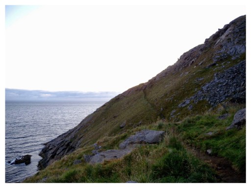 The hiking trail began on flattened ground, but soon weaved its way higher and higher along the side of the mountain Kleivheia. The path itself is not that steep at first, but it is narrow and the wall of the mountain plunges down into the ocean.