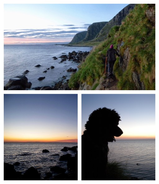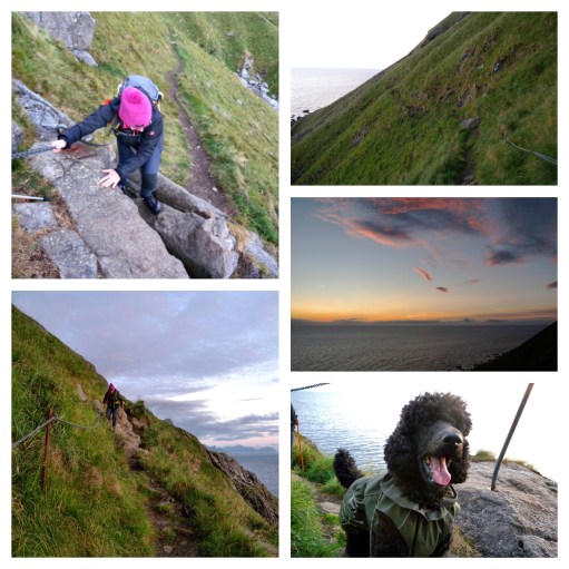 Snart gick det däremot brant upp längsmed fjällväggen igen, och vi fick än en gång klättra upp för en klippavsats. Här var stigen dessutom lerig, så hjärtat slog några extra slag av nervositet; ett felsteg så riskerade man att trilla ner i havet. Charlie var den av oss som hade det lättast att gå. Det är en fördel att ha fyra ben, vandringsstavar kan bara kompensera till viss del.