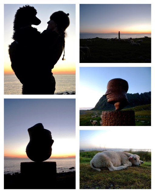 We soon reached Eggum Nature Reserve and on the outskirts of the reserve there is a fascinating artwork called Hode, the Head, made by the artist Markus Raetz. It is a head on a pedestal looking out over the ocean, and depending on which direction you look at it from the head will be upside down or upright. There is a well trodden path around the sculpture made by all the people who have walked around the head. There were sheep standing or laying everywhere.