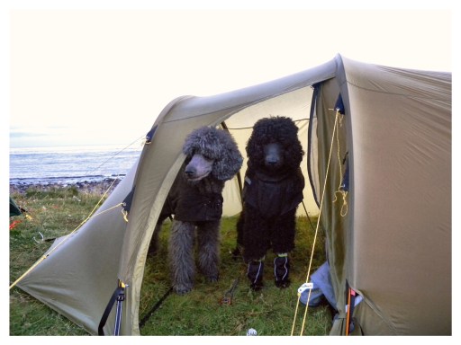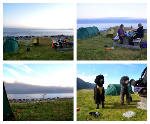 Vi hittade en fin plats vid ett bänkbord, och där slog vi upp våra tält. Här uppstod lite förvärring. Jag och hundarna hade sovit ett par nätter i min mosters tält när hon hade haft fler nattgäster, så hundarna var inte på det klara med vilket tält som de skulle bo i nu. De ställde sig i absiden till min mosters tält och stod sedan där och tittade på oss.