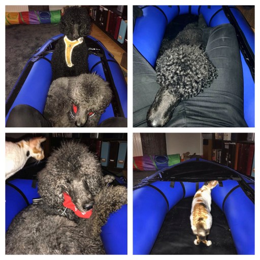 Så när erbjudandet kom att köpa en begagnad packraft så fanns det inte särdeles mycket att fundera på, och så snart jag kunde åkte jag iväg för att hämta hem min egna lilla gummibåt. Naturligtvis fick Oliver följa med och hämta den, och när vi kom hem så var jag bara tvungen att blåsa upp båten så att jag kunde prova om vi fick ordentligt plats alla tre. Det fick vi, och även Pussel inspekterade packraften; jag tvivlar däremot starkt på att hon kommer att få följa med ut och paddla.