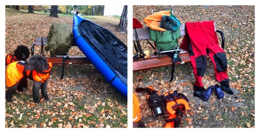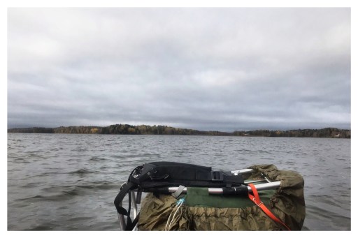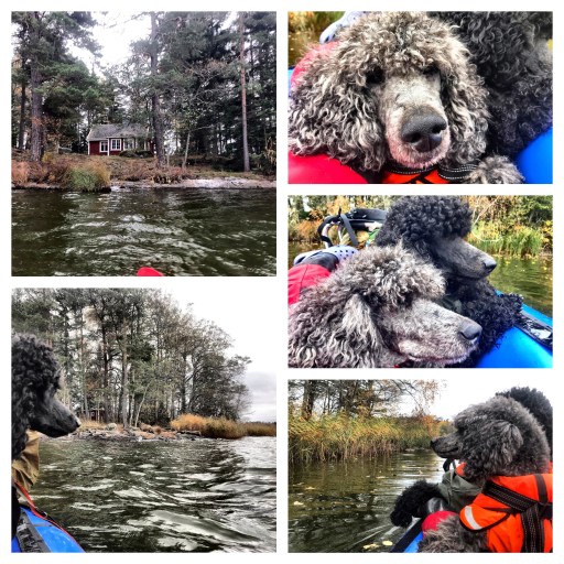 När jag började att knuffa ut båten för att sedan själv hoppa i tog fiskaren upp sin mobil och filmade oss. Som det måste ha sett ut; en gråmulen och kall höstdag dyker det upp en kvinna med två stora hundar som drar fram en blå gummibåt från en ryggsäck, blåser upp båten och sedan paddlar iväg med både hundar och ryggsäck ombord. Jag inser själv att det måste ha varit en rätt märklig syn. Däremot så undrar jag vad han gjorde med videon sedan.